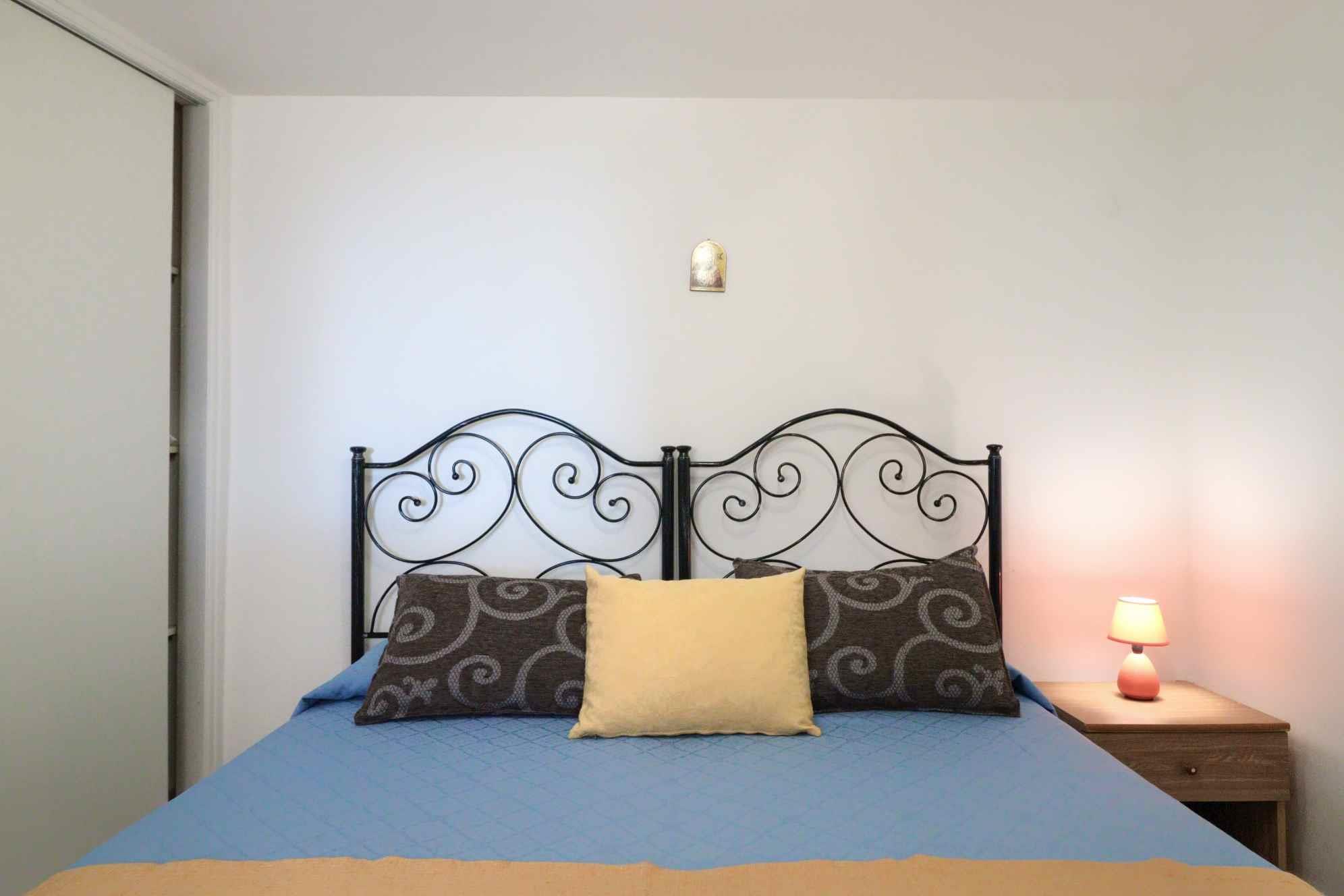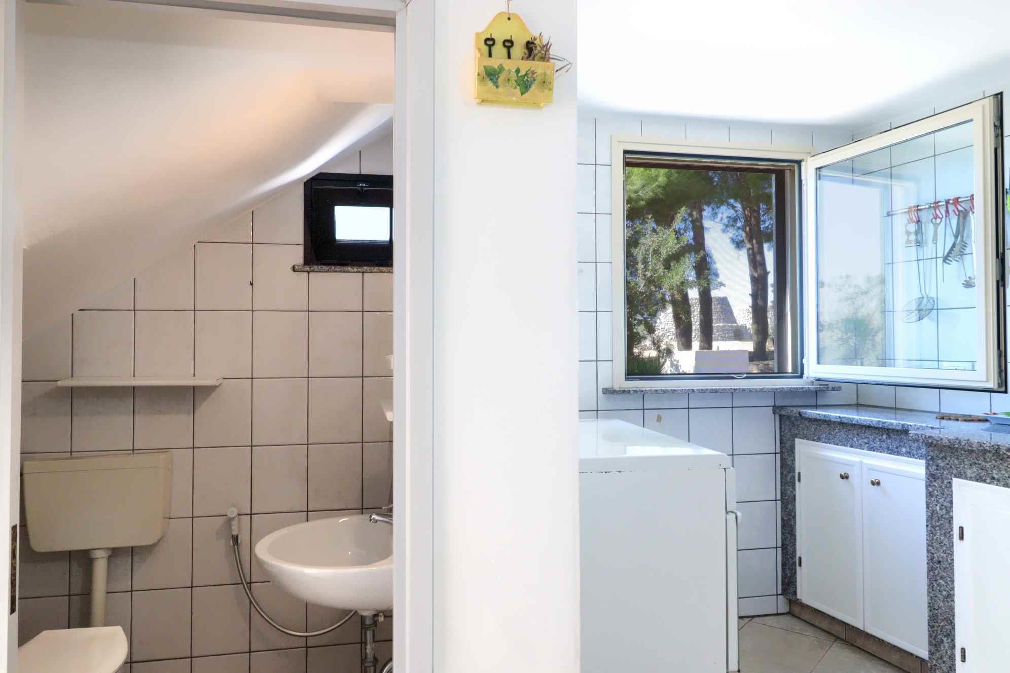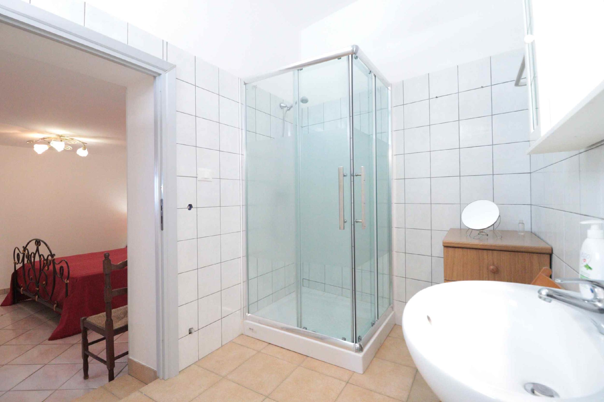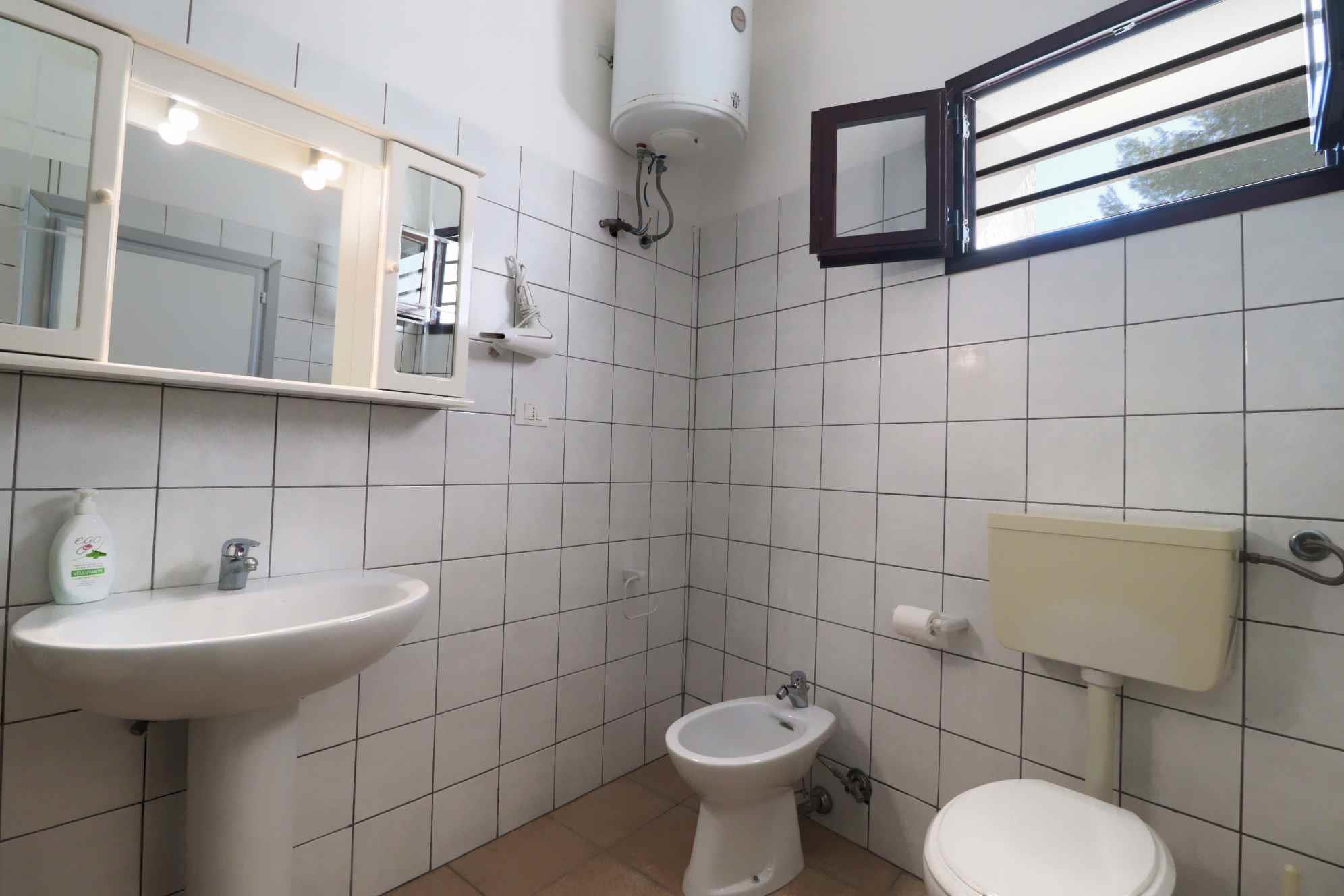 L’appartamento a piano terra è composto da due camere matrimoniali, soggiorno con bagno di servizio e bagno con box doccia. Inoltre ha una veranda attrezzata molto grande dove è possibile pranzare e stare tutti assieme ed è dotato di lavatrice, tv e doccia esterna.