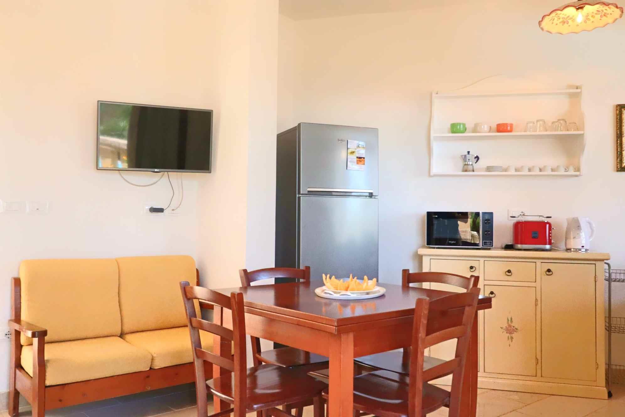 L’interno si compone di una fornitissima cucina, una camera matrimoniale, una camera doppia e un bagno con box doccia.