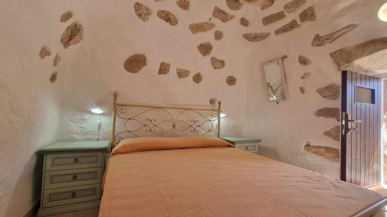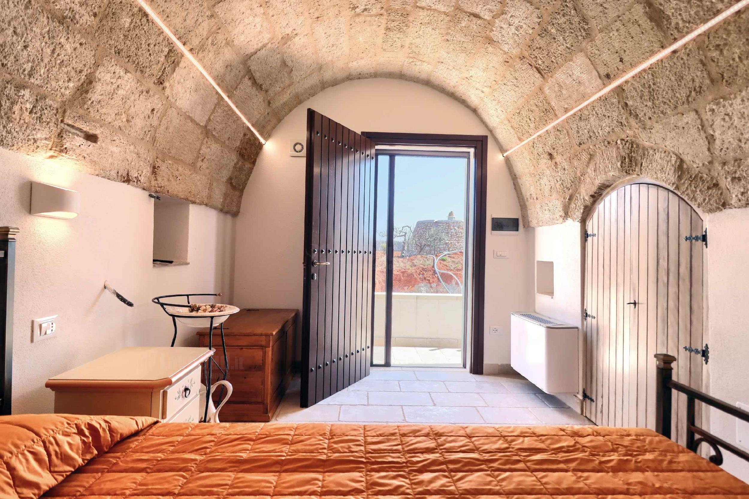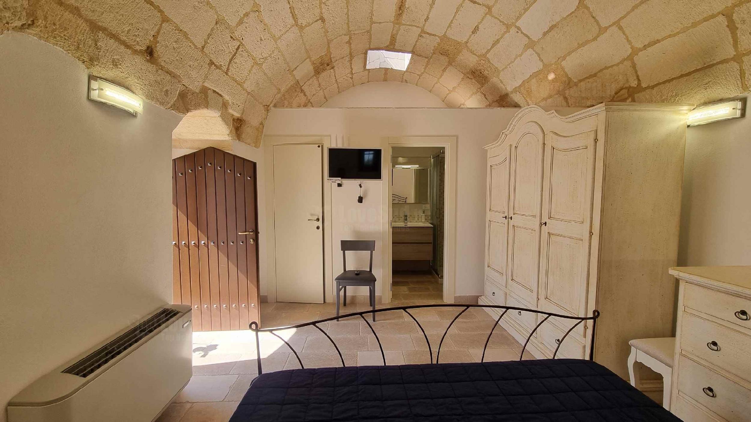 Dalla corte d’ingresso si accede a destra, alla cucina ben attrezzata, con tavolo da pranzo, tv e un frigo spazioso; a sinistra, la camera matrimoniale climatizzata con bagno, cabina armadio e le volte in pietra a faccia vista a botte. Frontalmente una porta mette in comunicazione attraverso un cortile esterno, che costeggia il giardino, le altre due camere, di cui una con letto alla francese e una matrimoniale con bagno, tutte provviste di cabina armadio, volte caratteristiche a botte, condizionatori e frigoriferi da camera. Sempre dal cortile esterno si accede ad un terzo bagnetto di servizio con lavanderia. A disposizione inoltre la quarta camera da letto ricavata da un ulteriore trullo distante circa 15 metri dal corpo centrale e dotata di un quarto bagno completo (accessibile solo dall’esterno).