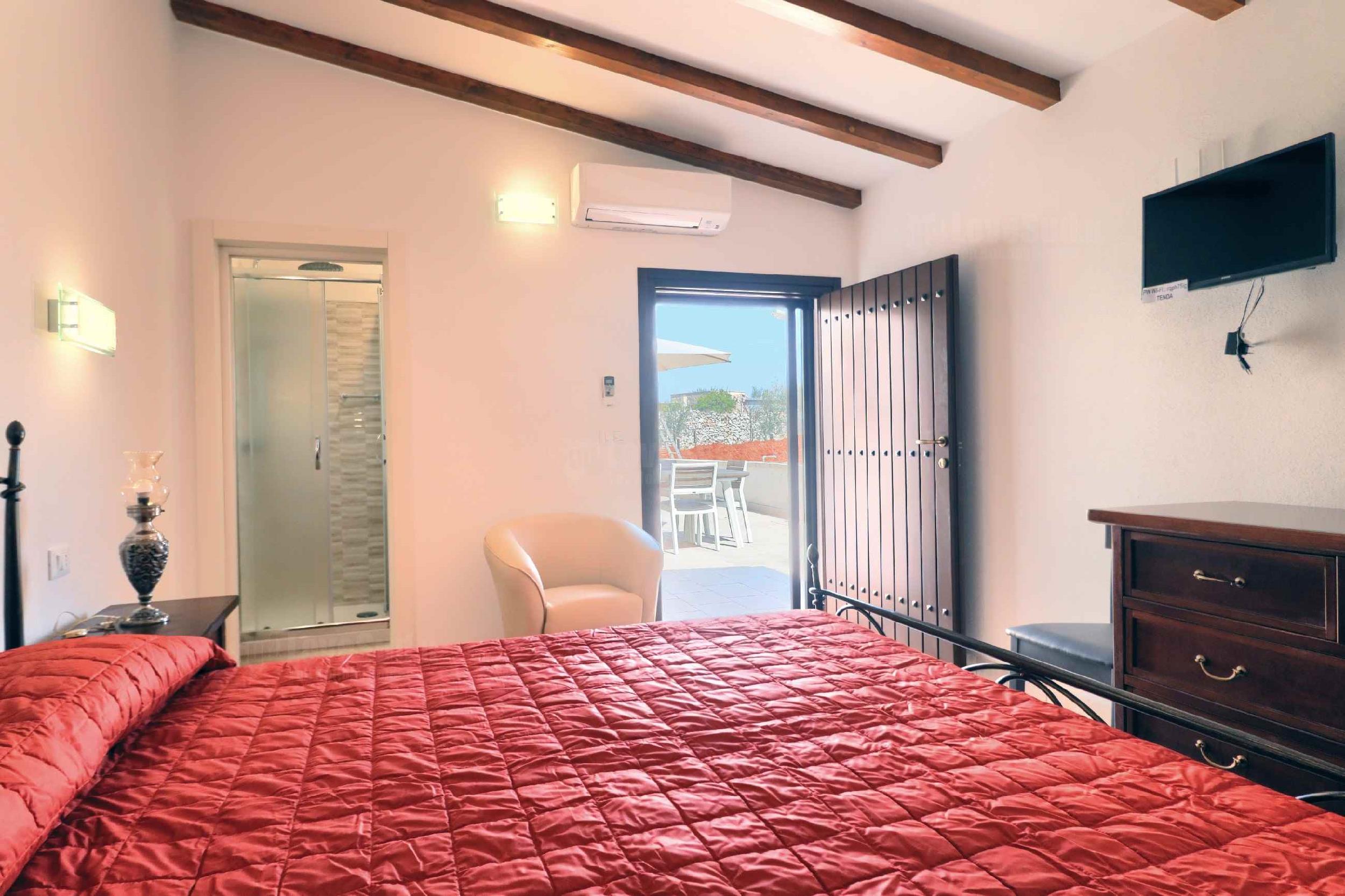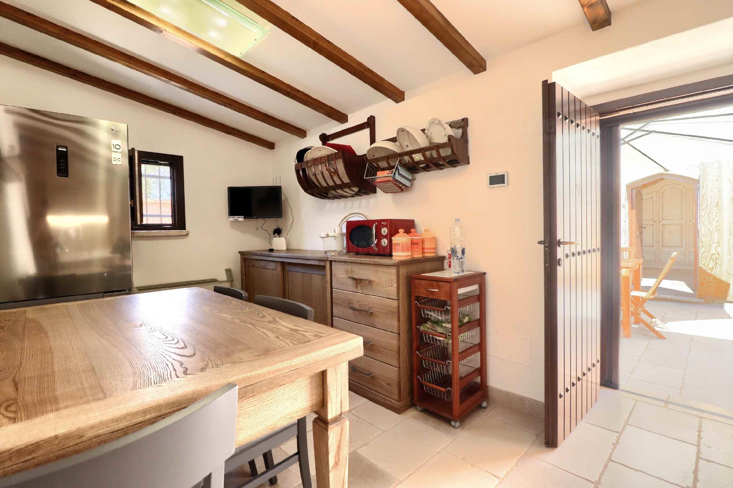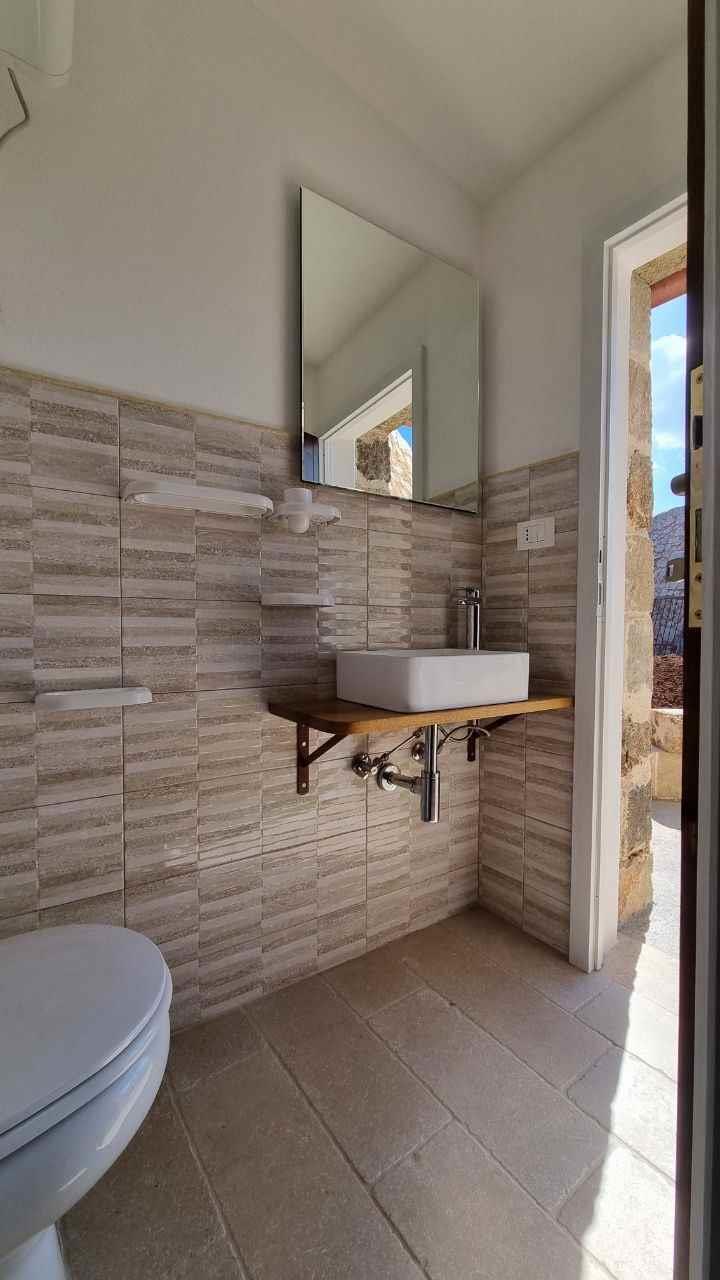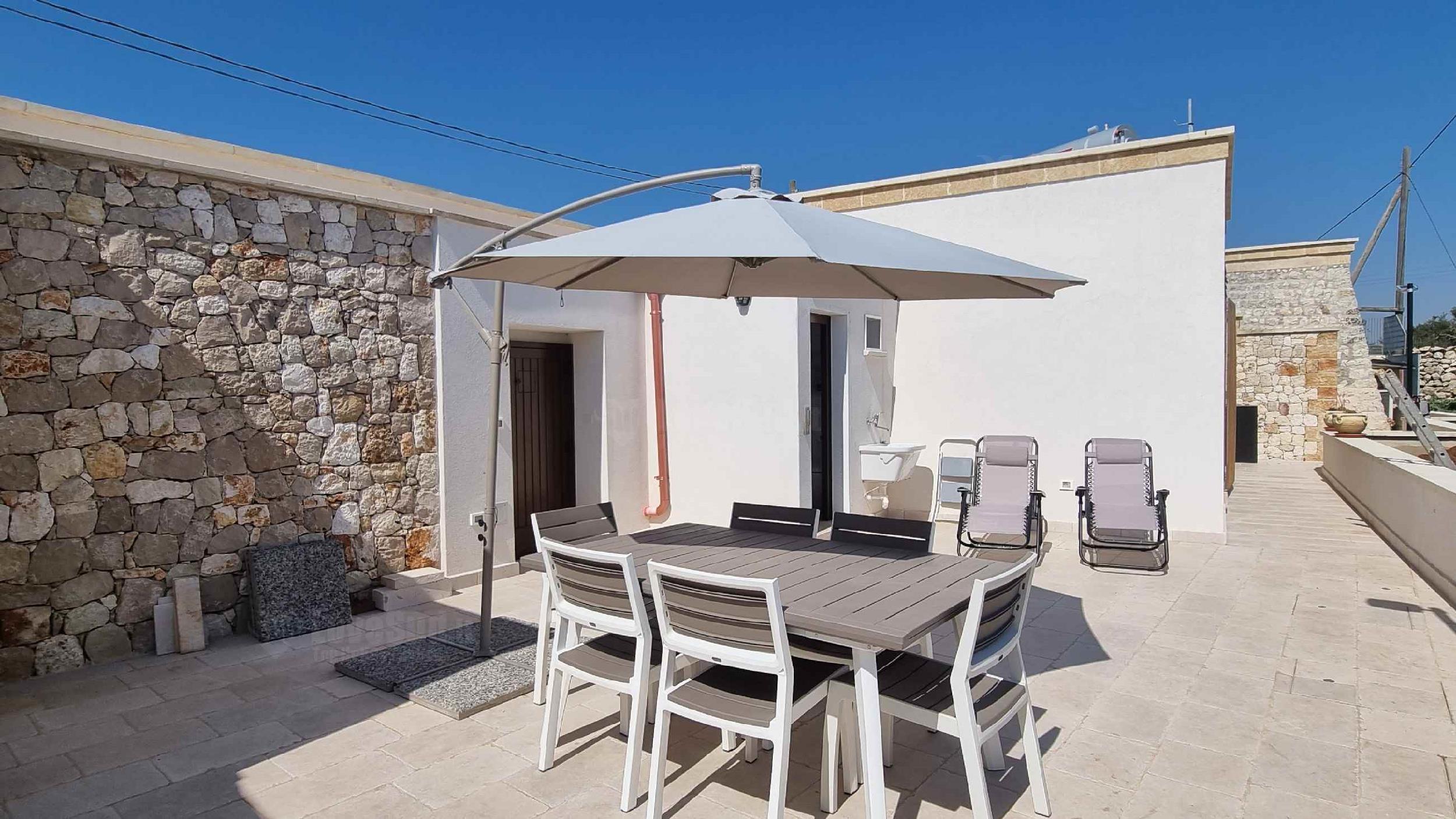 Dalla corte d’ingresso si accede a destra, alla cucina ben attrezzata, con tavolo da pranzo, tv e un frigo spazioso; a sinistra, la camera matrimoniale climatizzata con bagno, cabina armadio e le volte in pietra a faccia vista a botte. Frontalmente una porta mette in comunicazione attraverso un cortile esterno, che costeggia il giardino, le altre due camere, di cui una con letto alla francese e una matrimoniale con bagno, tutte provviste di cabina armadio, volte caratteristiche a botte, condizionatori e frigoriferi da camera. Sempre dal cortile esterno si accede ad un terzo bagnetto di servizio con lavanderia. A disposizione inoltre la quarta camera da letto ricavata da un ulteriore trullo distante circa 15 metri dal corpo centrale e dotata di un quarto bagno completo (accessibile solo dall’esterno).