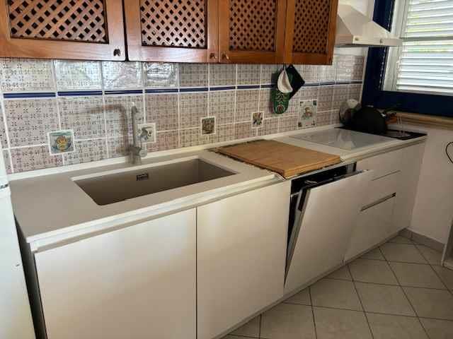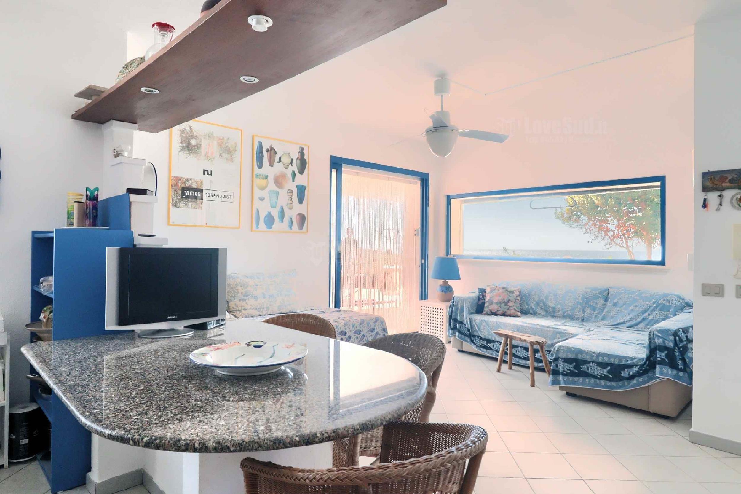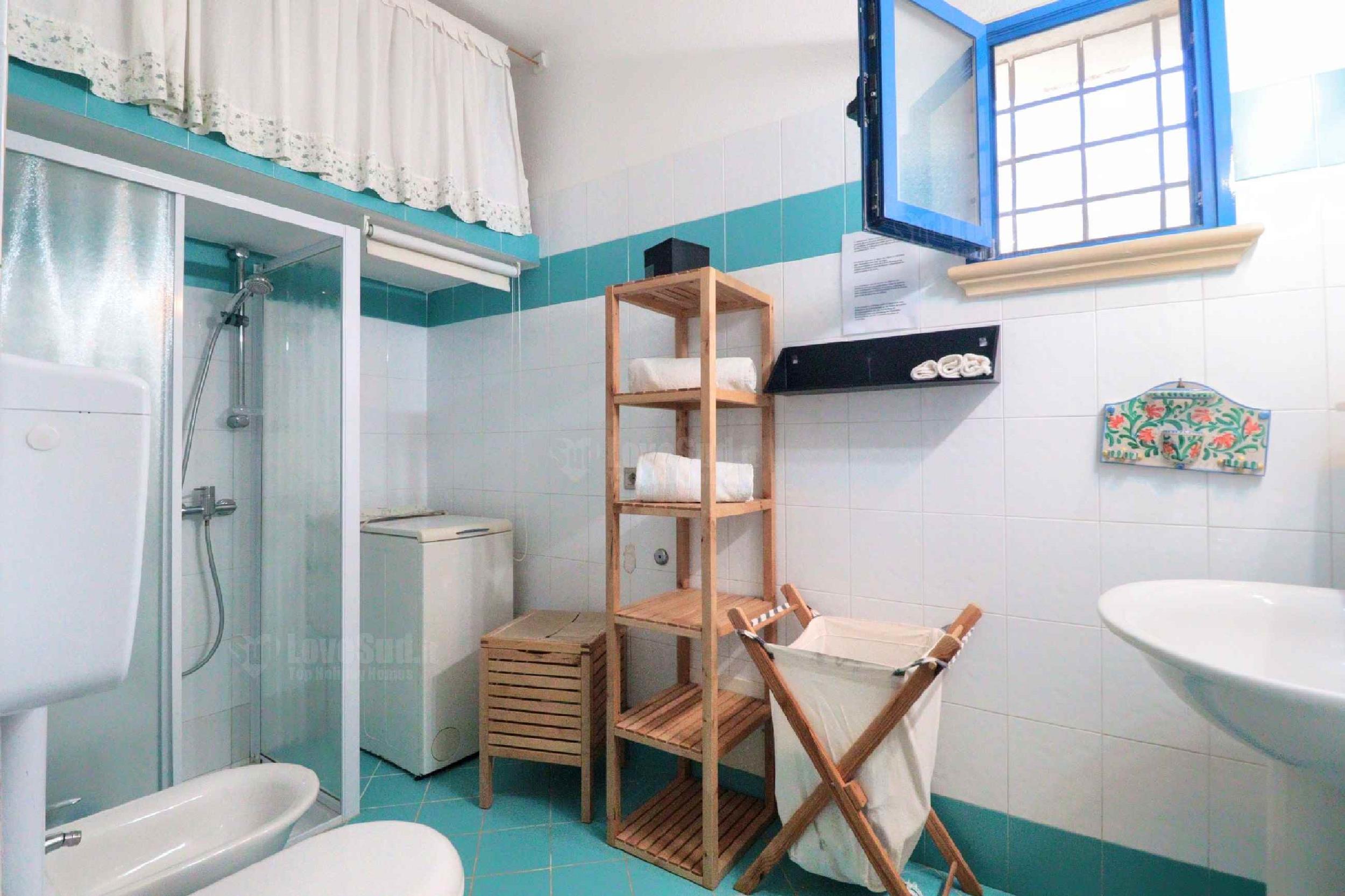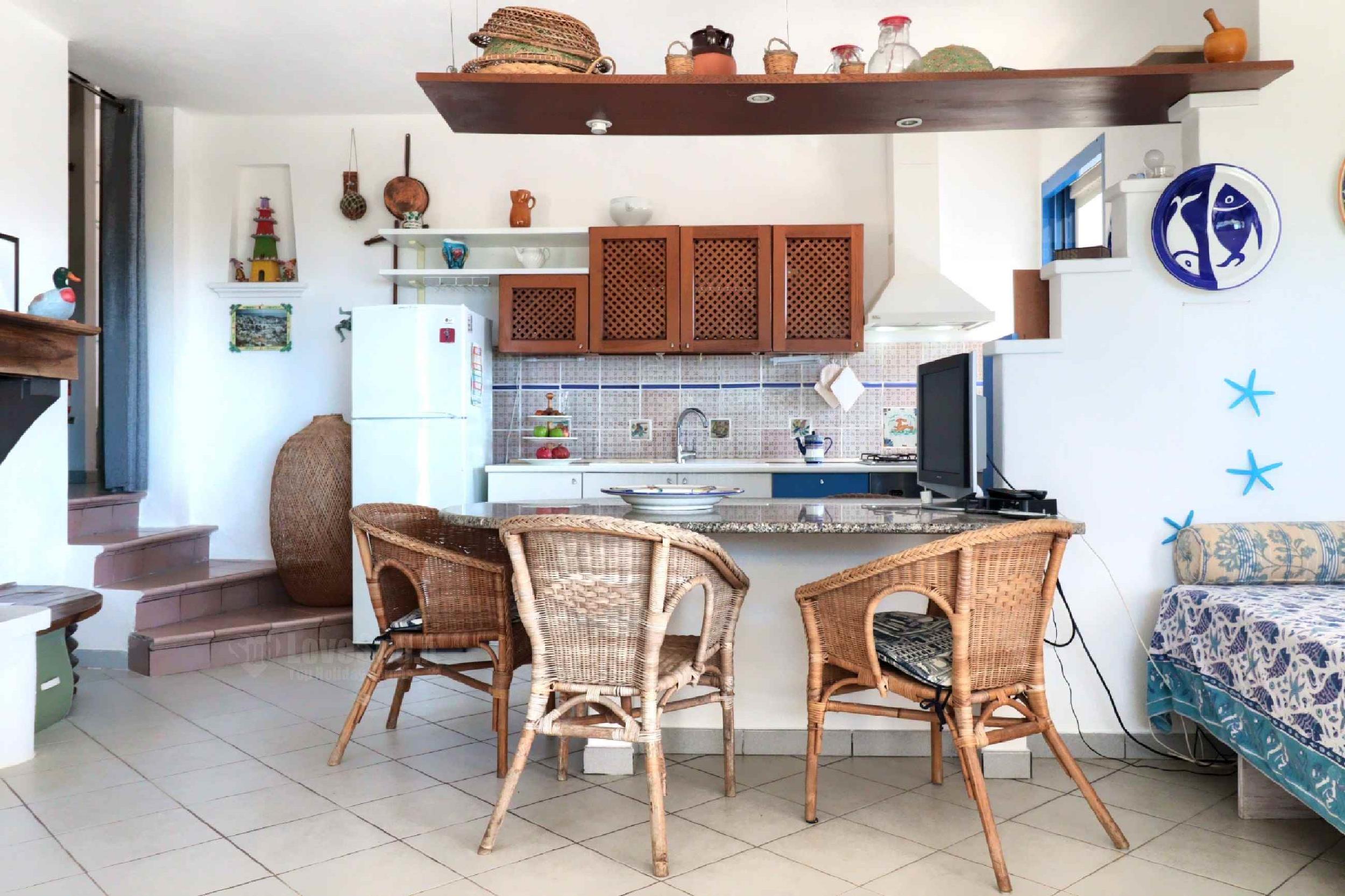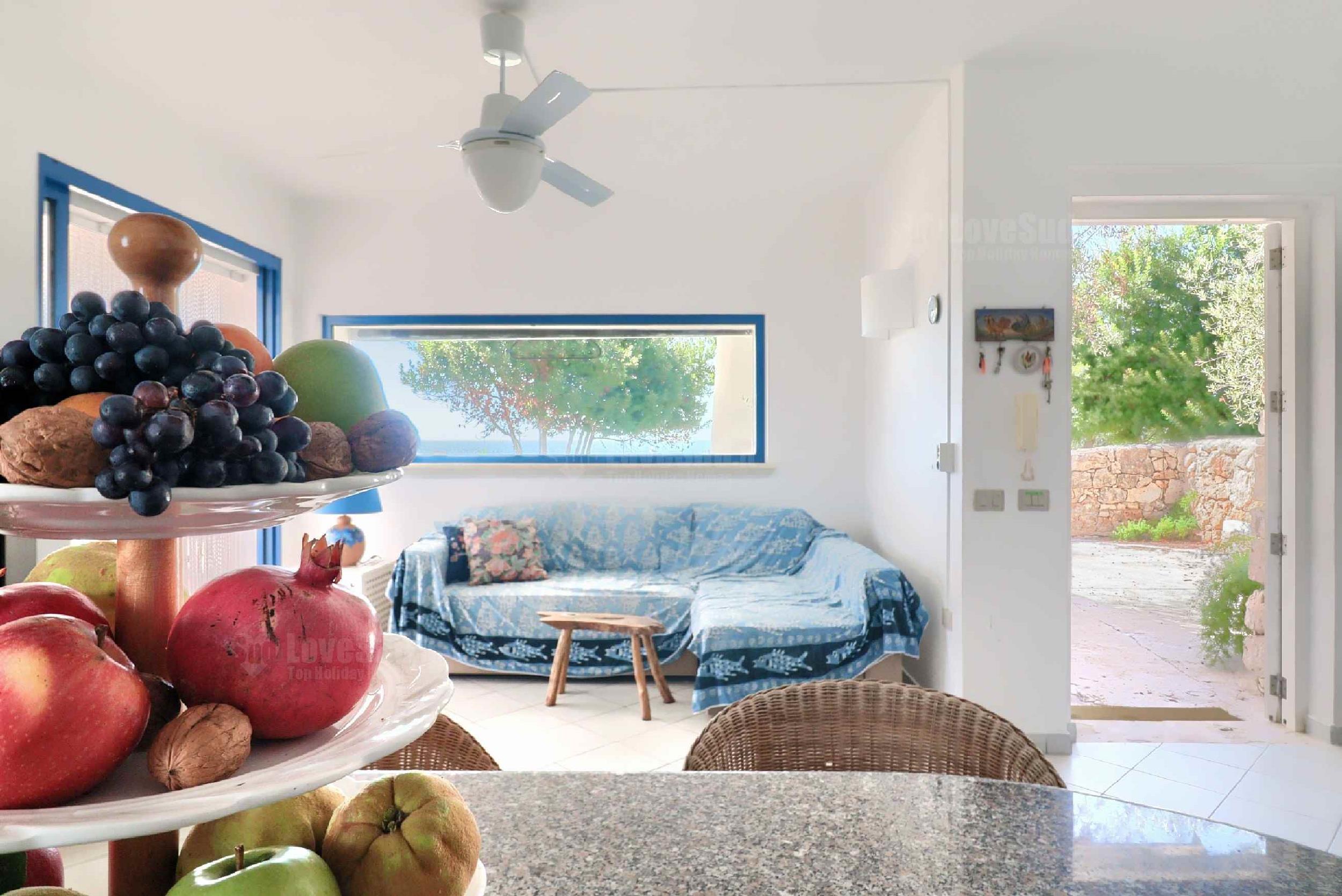 All’interno presenta un grazioso living vista mare con cucina con penisola, un caratteristico camino in pietra e due divani. La zona notte è costituita da due camere da letto di cui una matrimoniale vista mare e l’altra doppia con due letti singoli. Infine vi è un bagno completo di servizi. Vi è un climatizzatore posizionato nella zona notte, nel punto di passaggio tra le due camere.