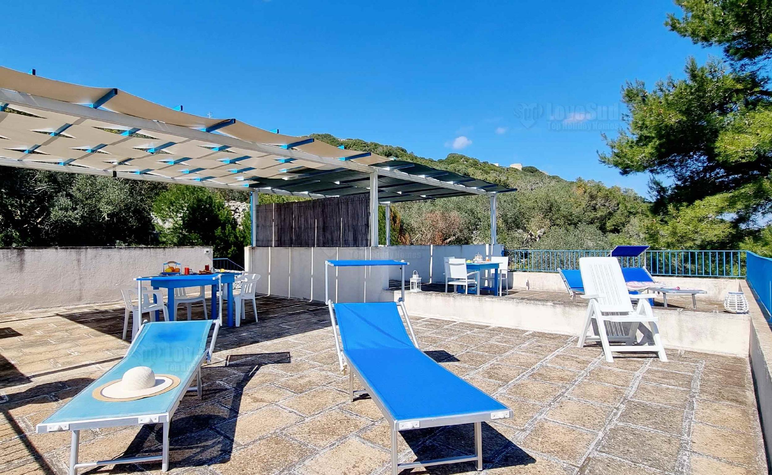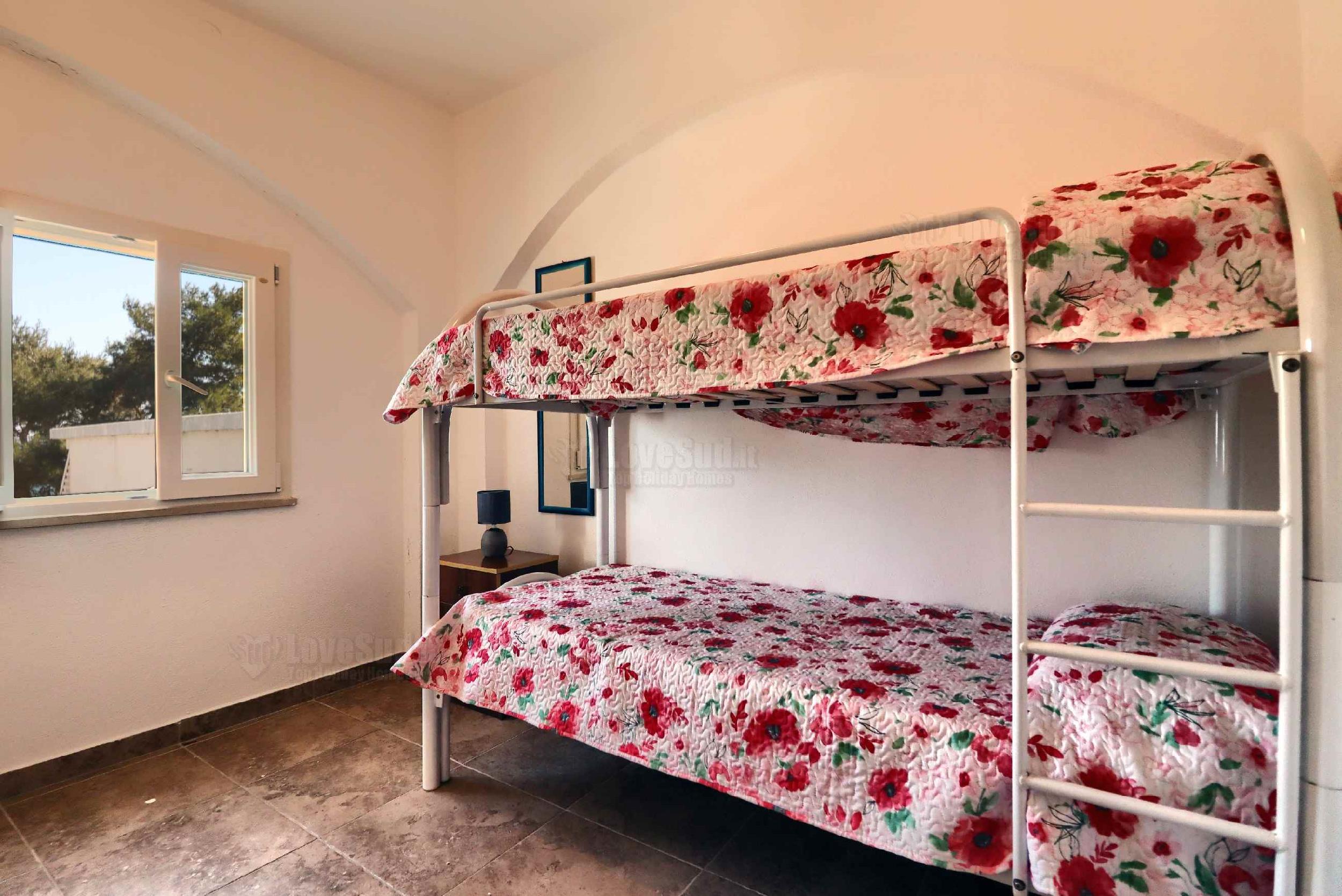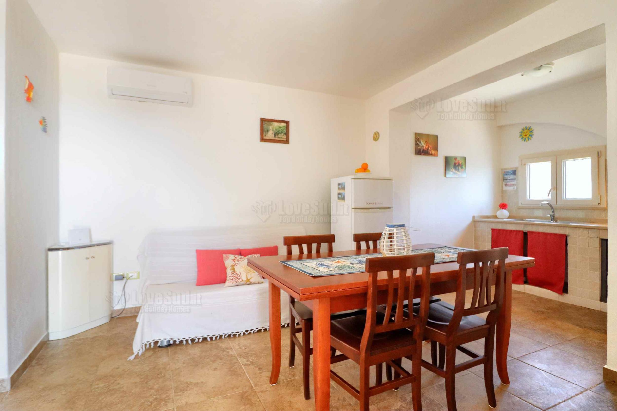 L’ultima casa è proprio casa Roberta che rispetto alle altre due, ha una posizione privilegiata in quanto più alta e con una più ampia vista sul mare. La dimora gode di una graziosa veranda con tavolo, sedie, barbecue lavabo e una doccia esterna. All’interno vi è un bel living climatizzato dotato di tv, divano letto matrimoniale e una cucina in muratura. La zona notte è formata da tre camere da letto, due matrimoniali e una con letto a castello. Infine due bagni: uno completo di servizi e l’altro costituito solo da lavandino e water.