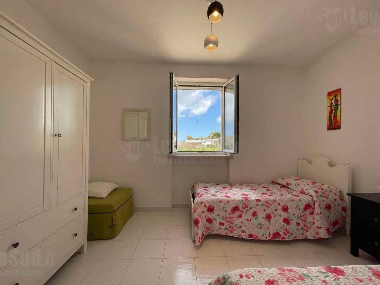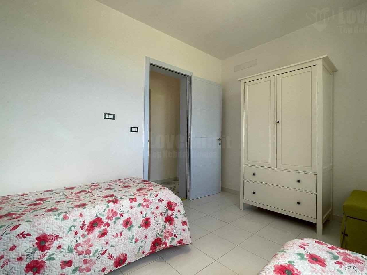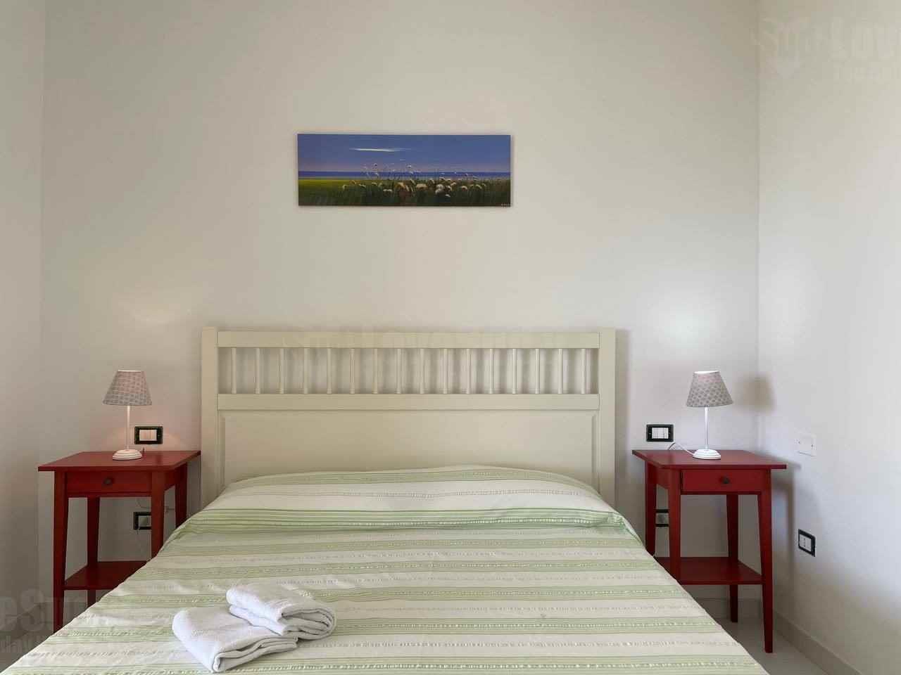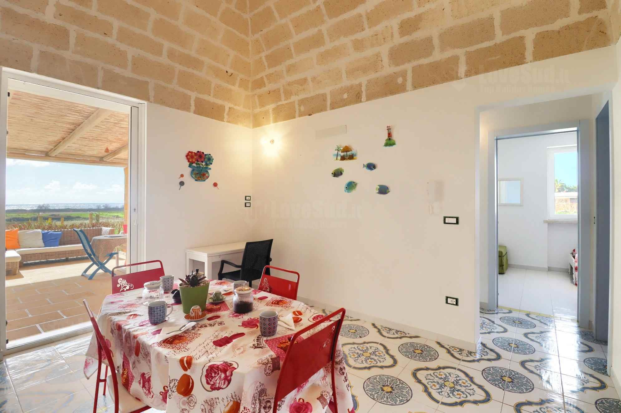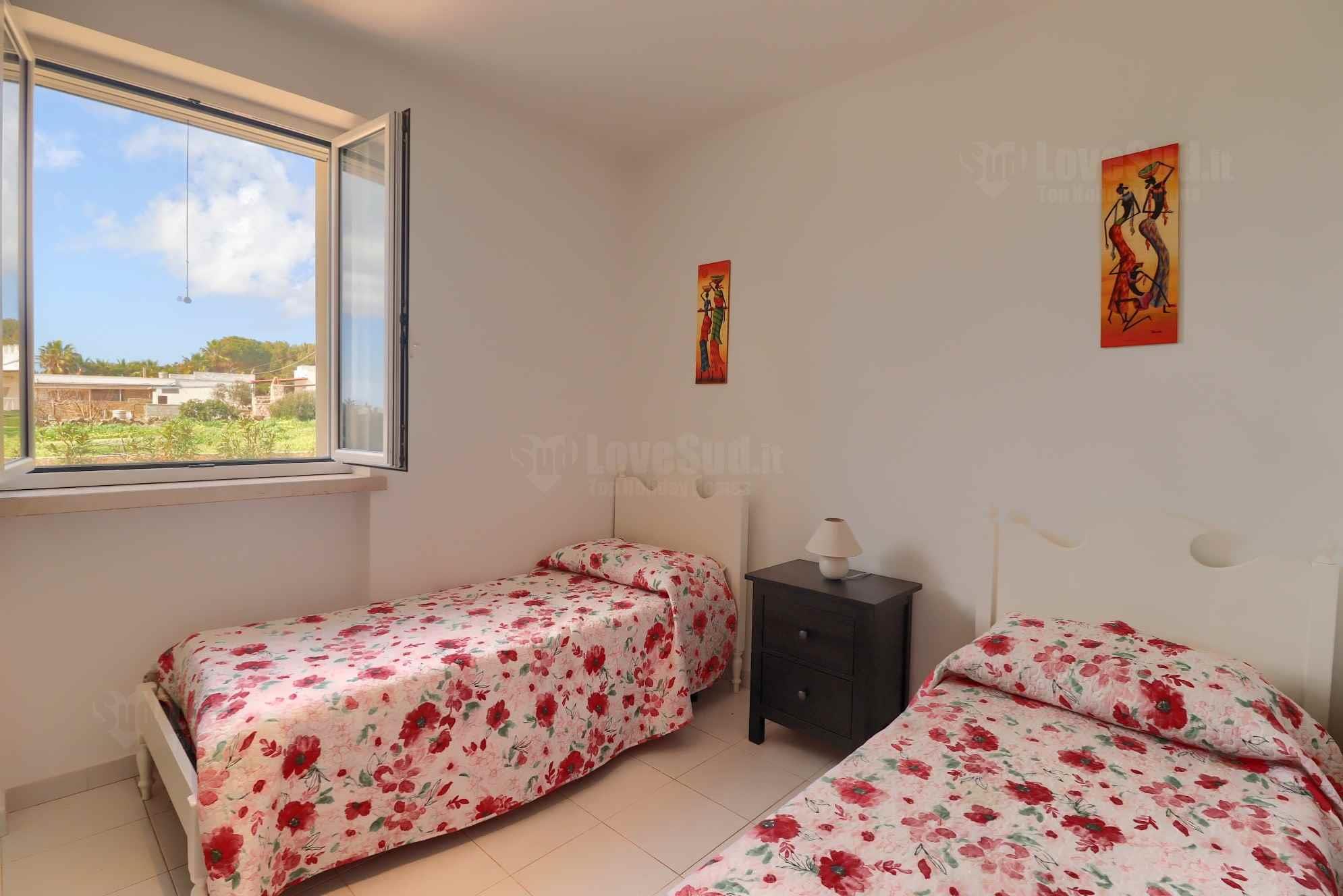 All’interno la volta a stella caratterizza il bel living arredato con divano, tavolo e tv dove vi è una cucina dotata di ogni utensile tra cui il forno. La zona notte è formata da due camere da letto, una matrimoniale, l’altra doppia con due letti singoli dove vi è un ulteriore “pouf” letto singolo apribile per una quinta persona. Da questo ambiente si può anche uscire direttamente sulla veranda. Nel disimpegno tra le due camere vi è un climatizzatore posizionato al centro. Infine un bagno dotato di ogni servizio.