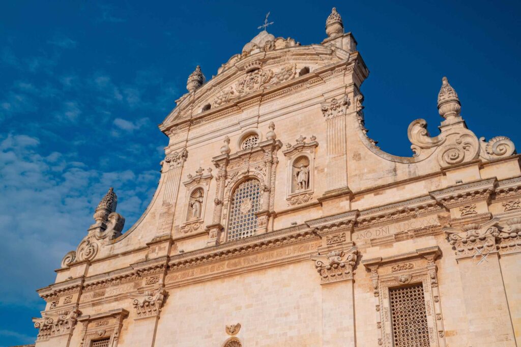 Costruita nel 1633, la Chiesa Madre è tra gli esempi più affascinanti di barocco leccese. Sui lati della facciata figurano le statue dei Santi Pietro e Paolo (patroni della città), mentre l’interno custodisce un patrimonio artistico di enorme valore, tra altari in marmo policromo, affreschi e decorazioni.