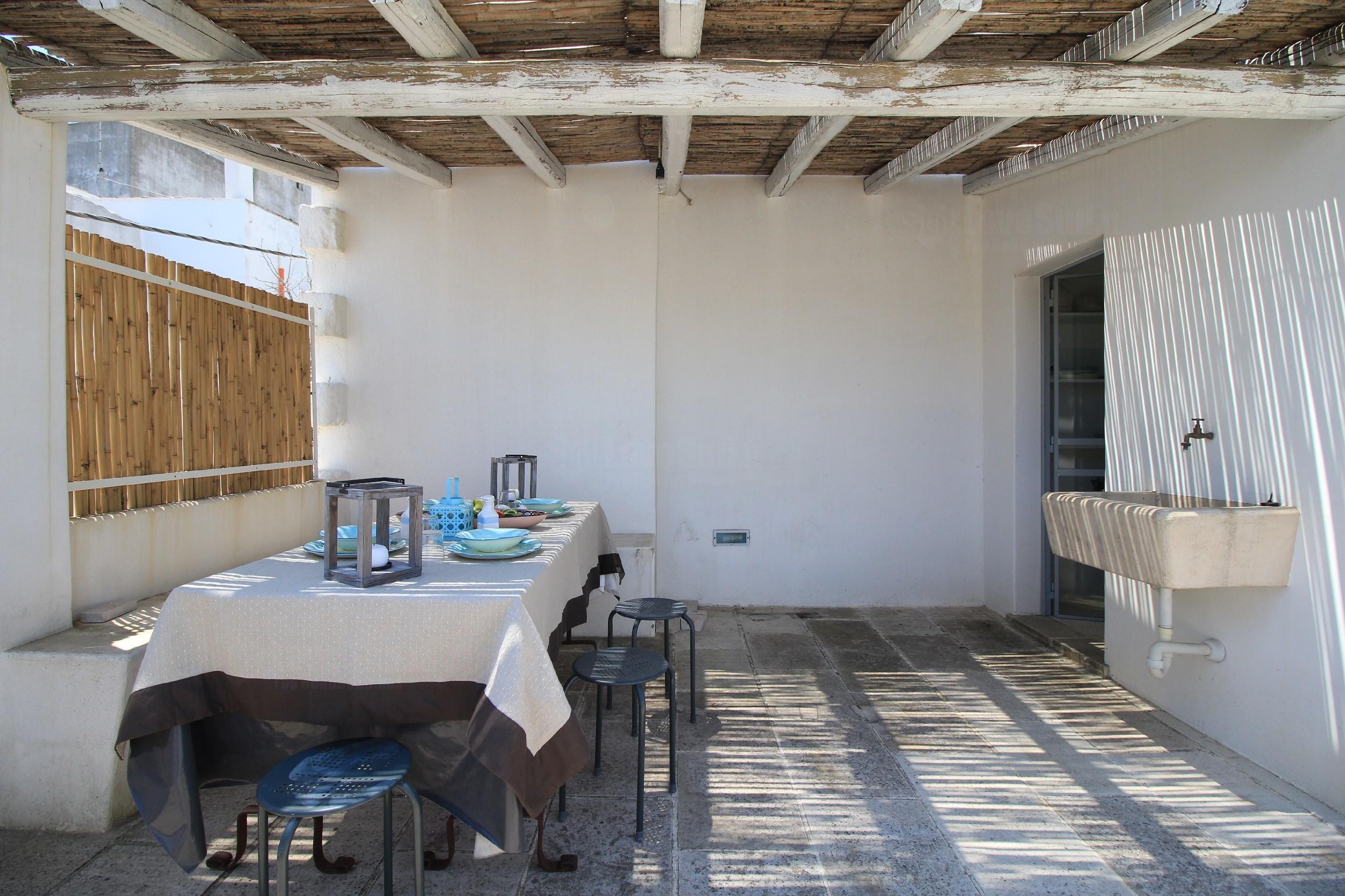 Antica dimora ristrutturata con sapienza ed eleganza a Gagliano del Capo. L’affascinante dimora ha una graziosa verandina esterna attrezzata con terrazzino – solarium coperto da pergolato.
