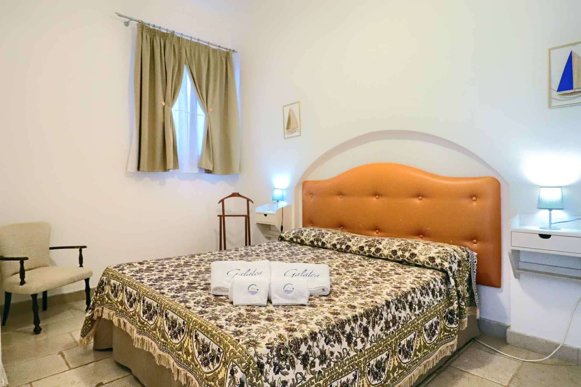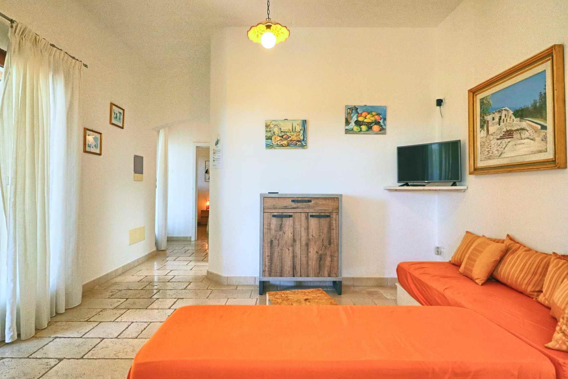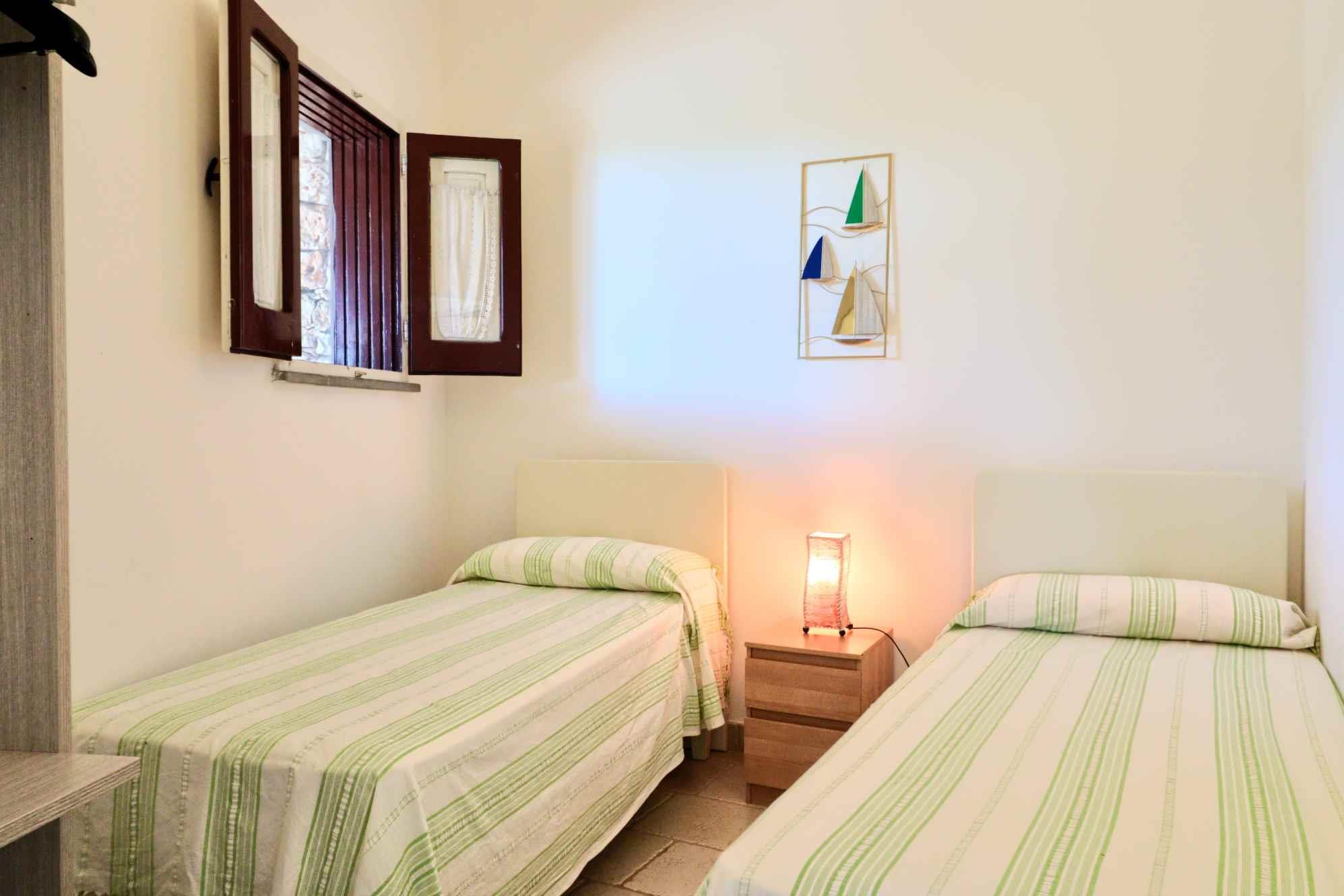 L’interno si compone di una luminosa zona giorno con angolo cottura e divani, una camera matrimoniale, una camera doppia e un bagno con doccia.