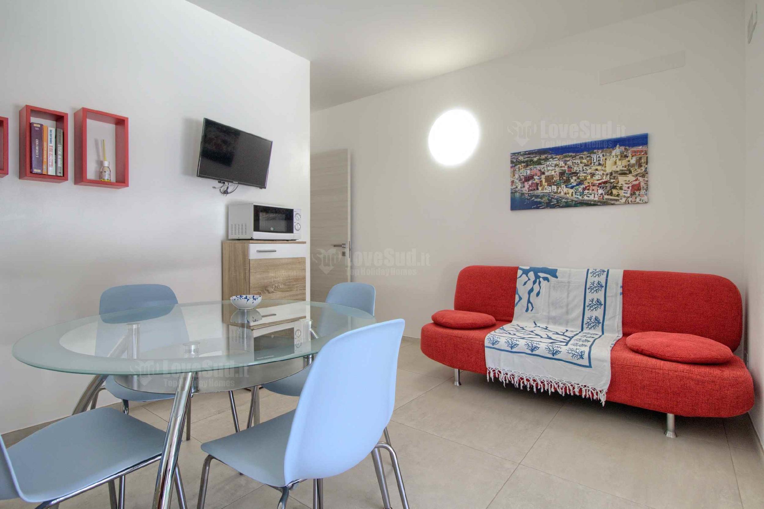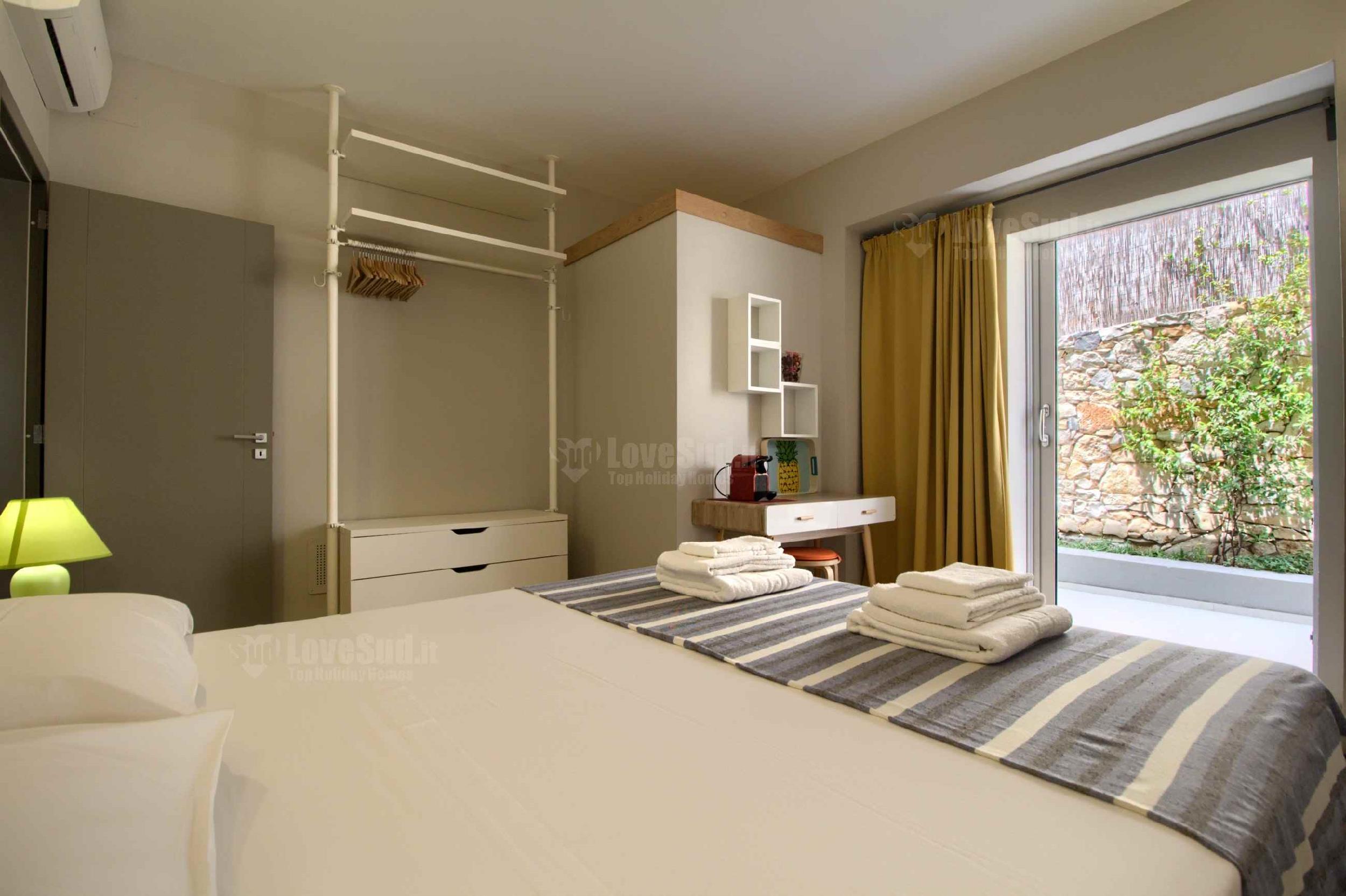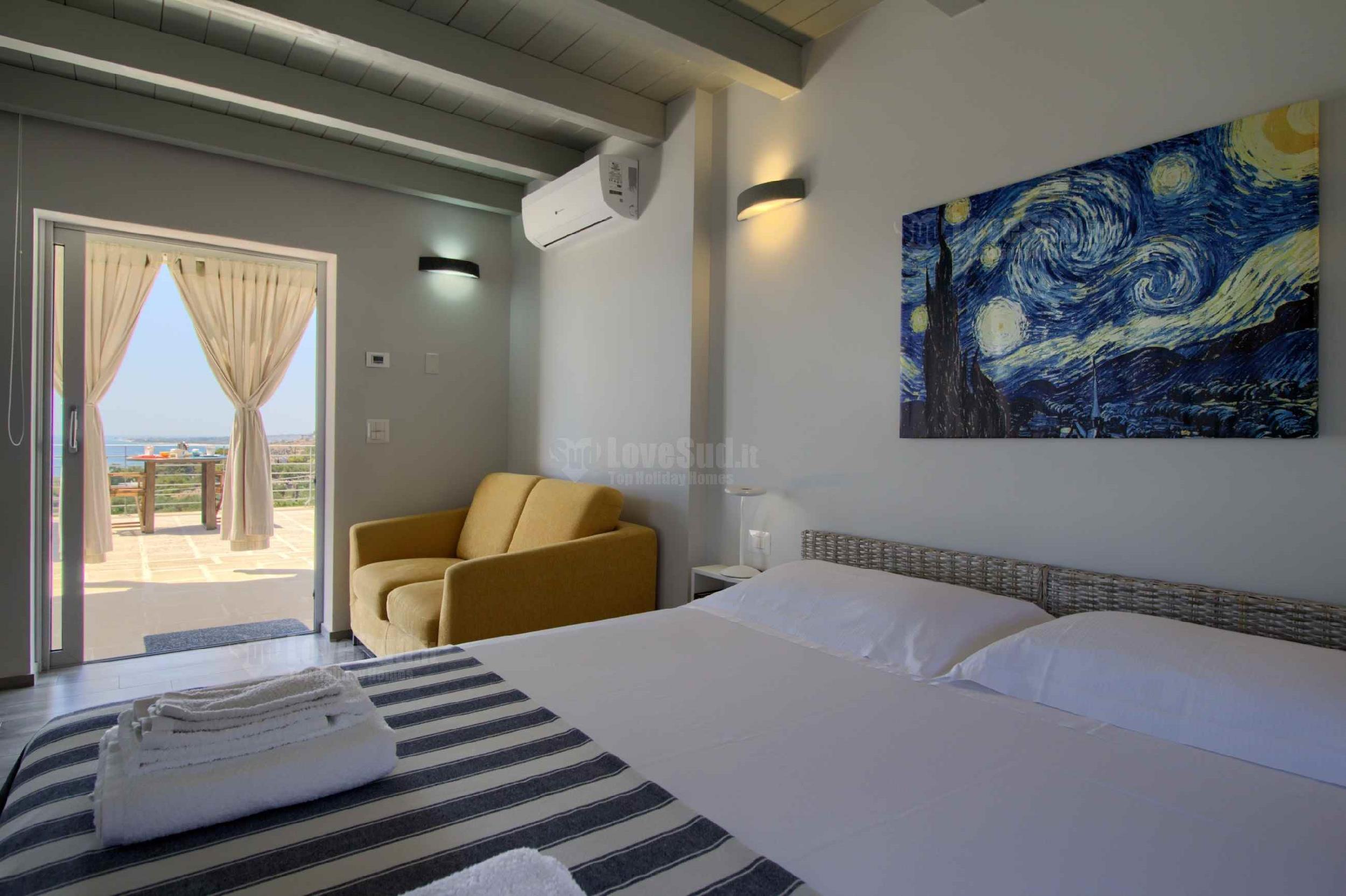 - Terzo alloggio situato al secondo piano con ampia terrazza indipendente e riservata da cui si gode una vista mare mozzafiato. Alloggio open space climatizzato di circa 40 mq dotato di cucina accessoriata, letto matrimoniale, bagno completo e divano letto ideale solo per bambini. Esternamente ampia veranda accessoriata con salottino.