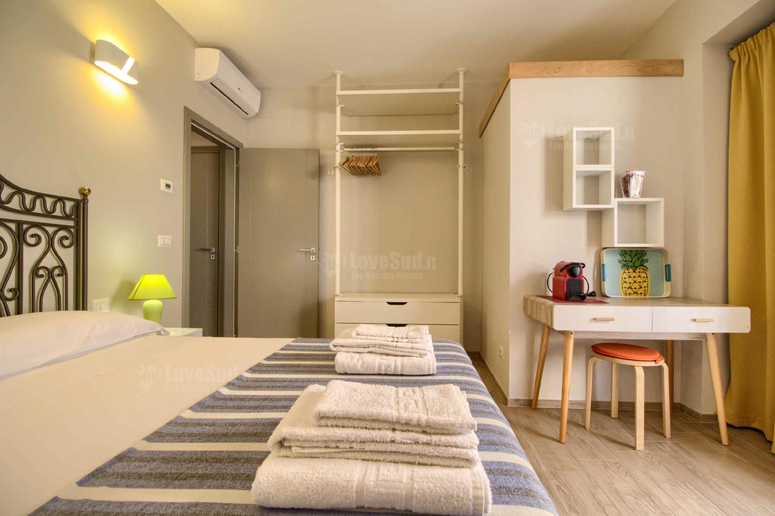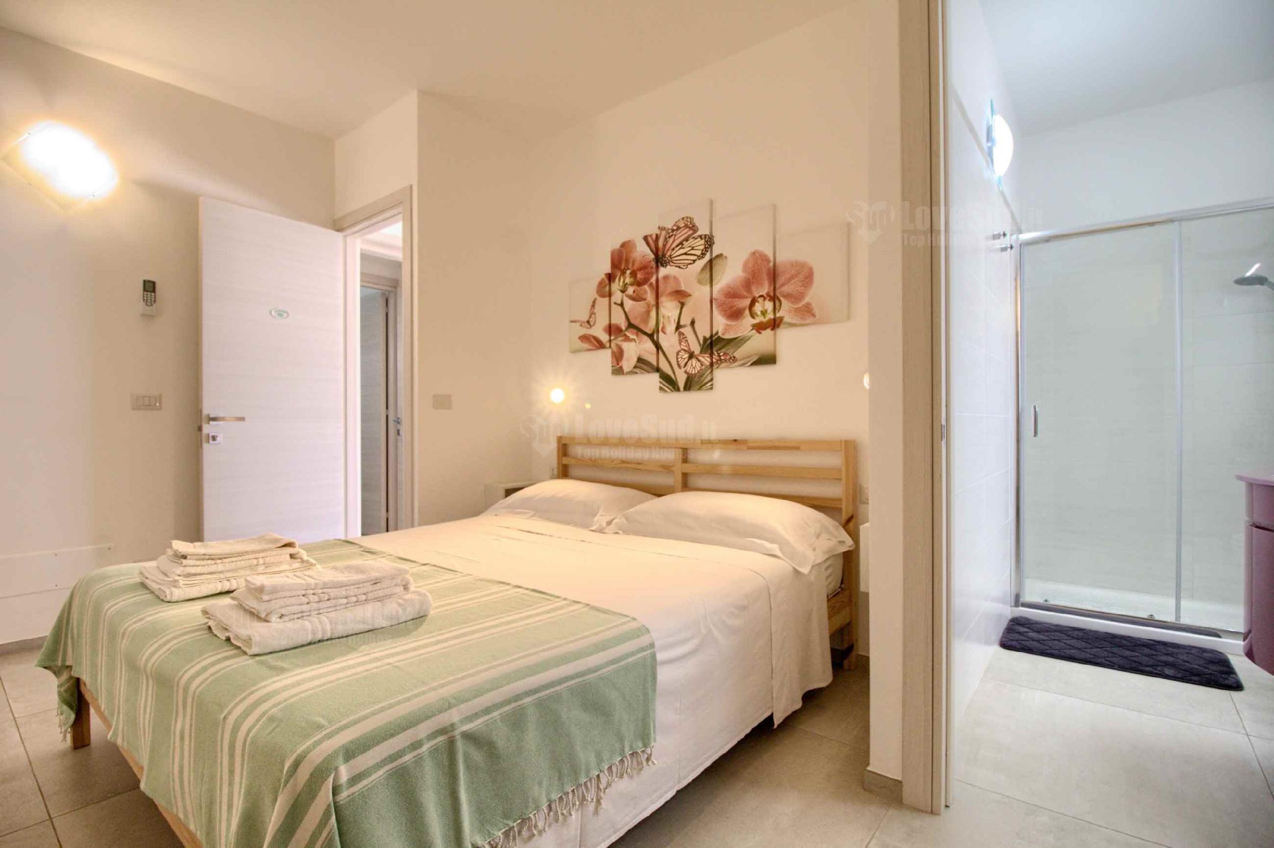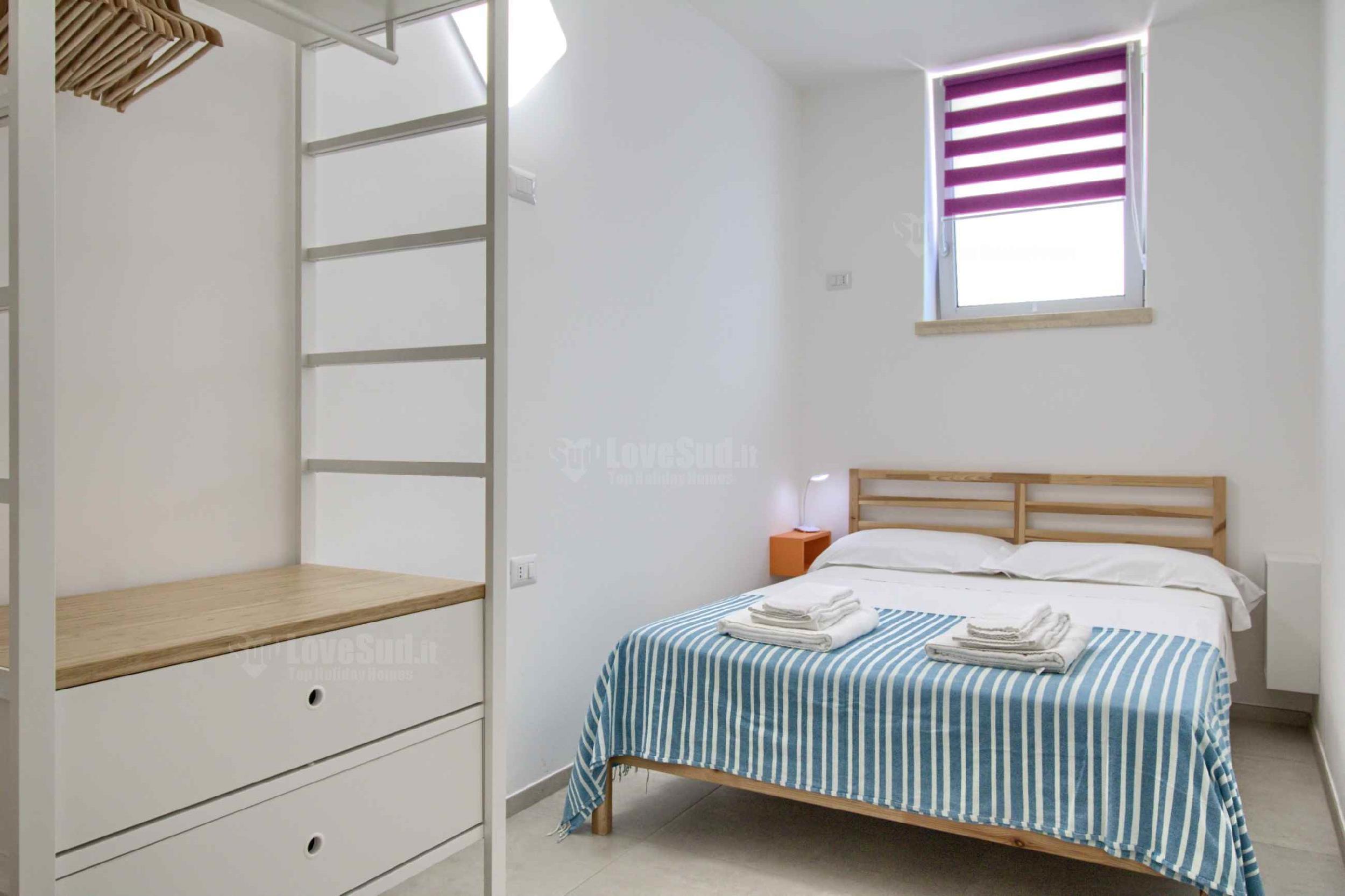 - Terzo alloggio situato al secondo piano con ampia terrazza indipendente e riservata da cui si gode una vista mare mozzafiato. Alloggio open space climatizzato di circa 40 mq dotato di cucina accessoriata, letto matrimoniale, bagno completo e divano letto ideale solo per bambini. Esternamente ampia veranda accessoriata con salottino.