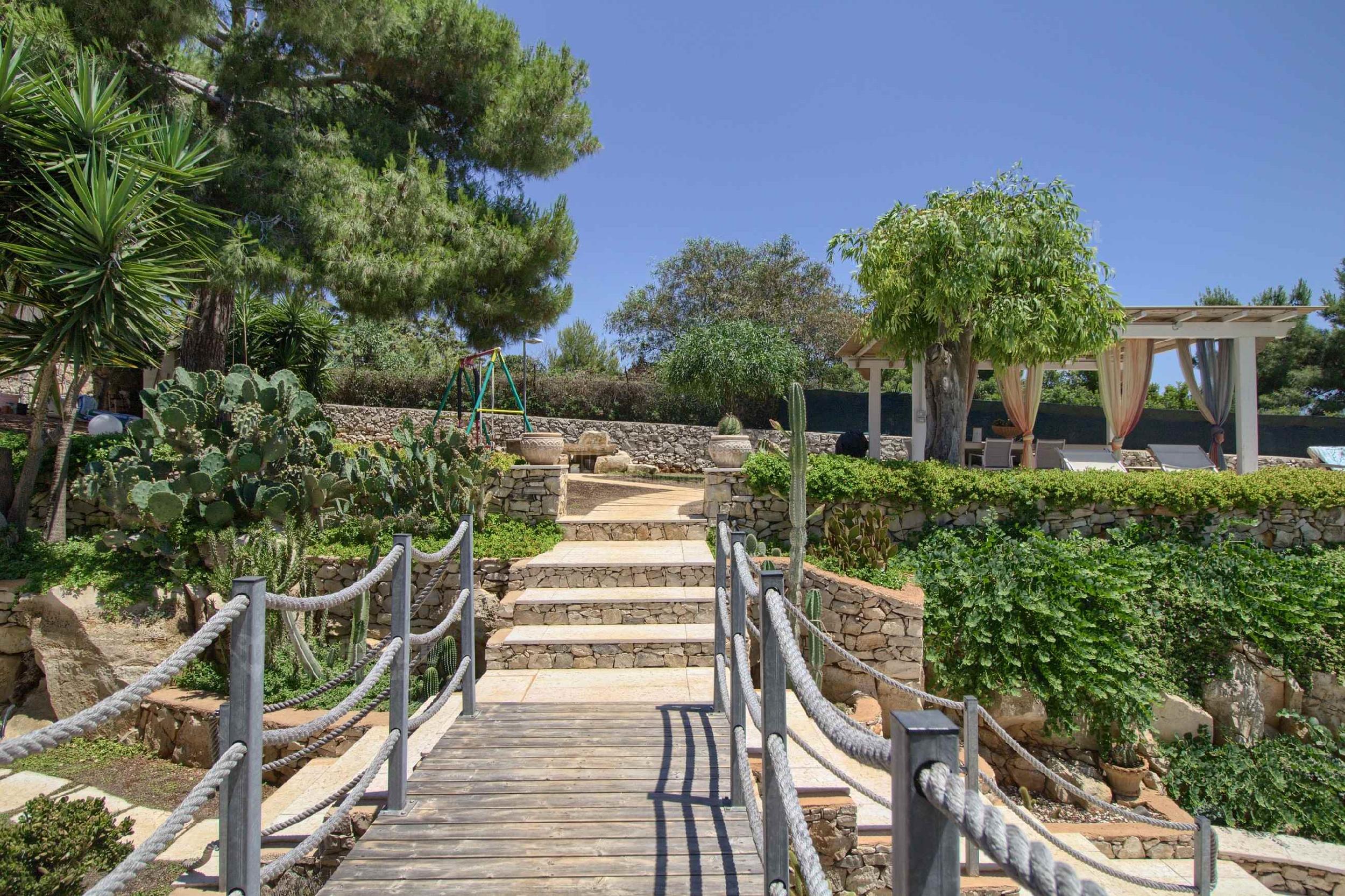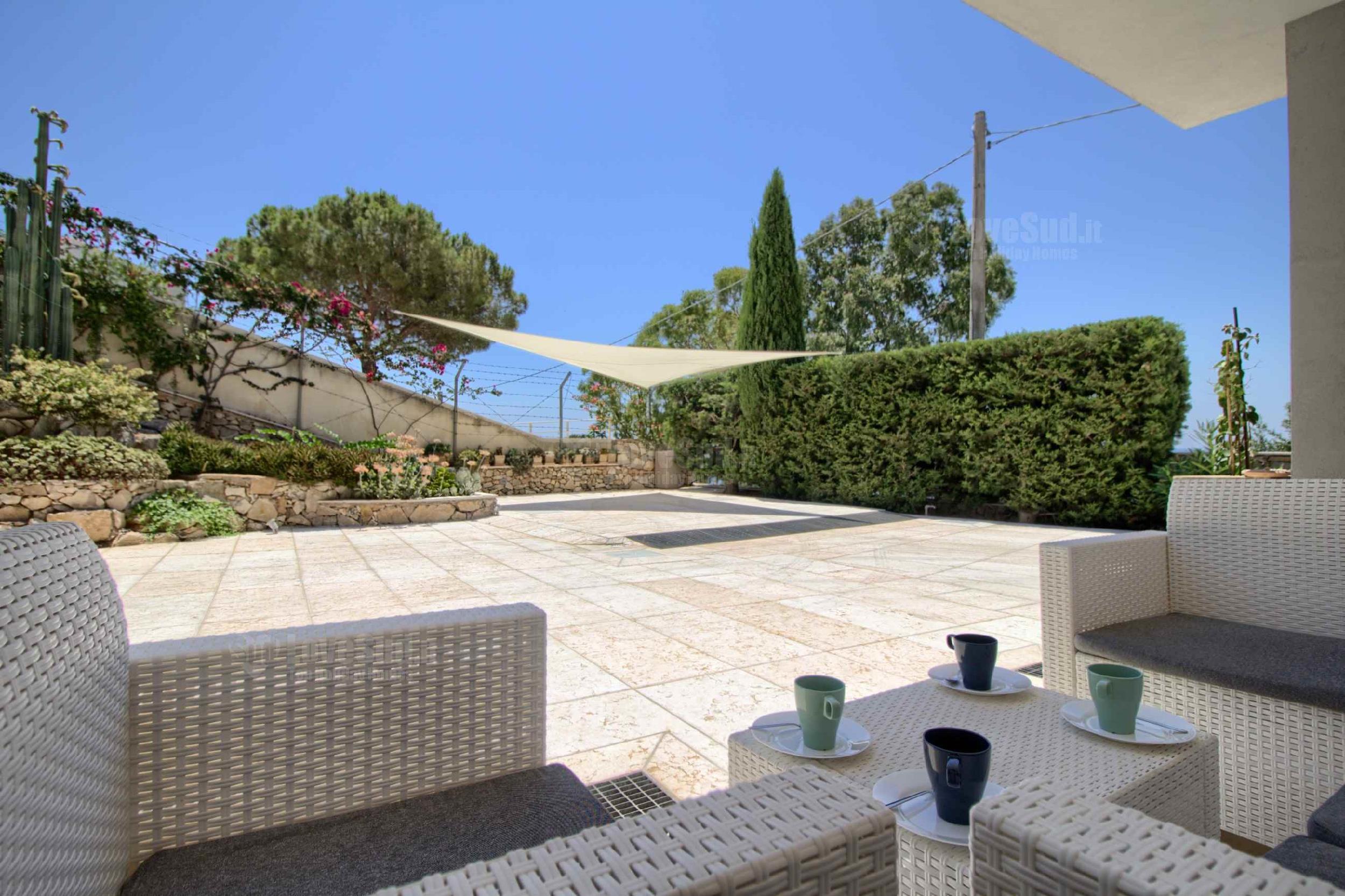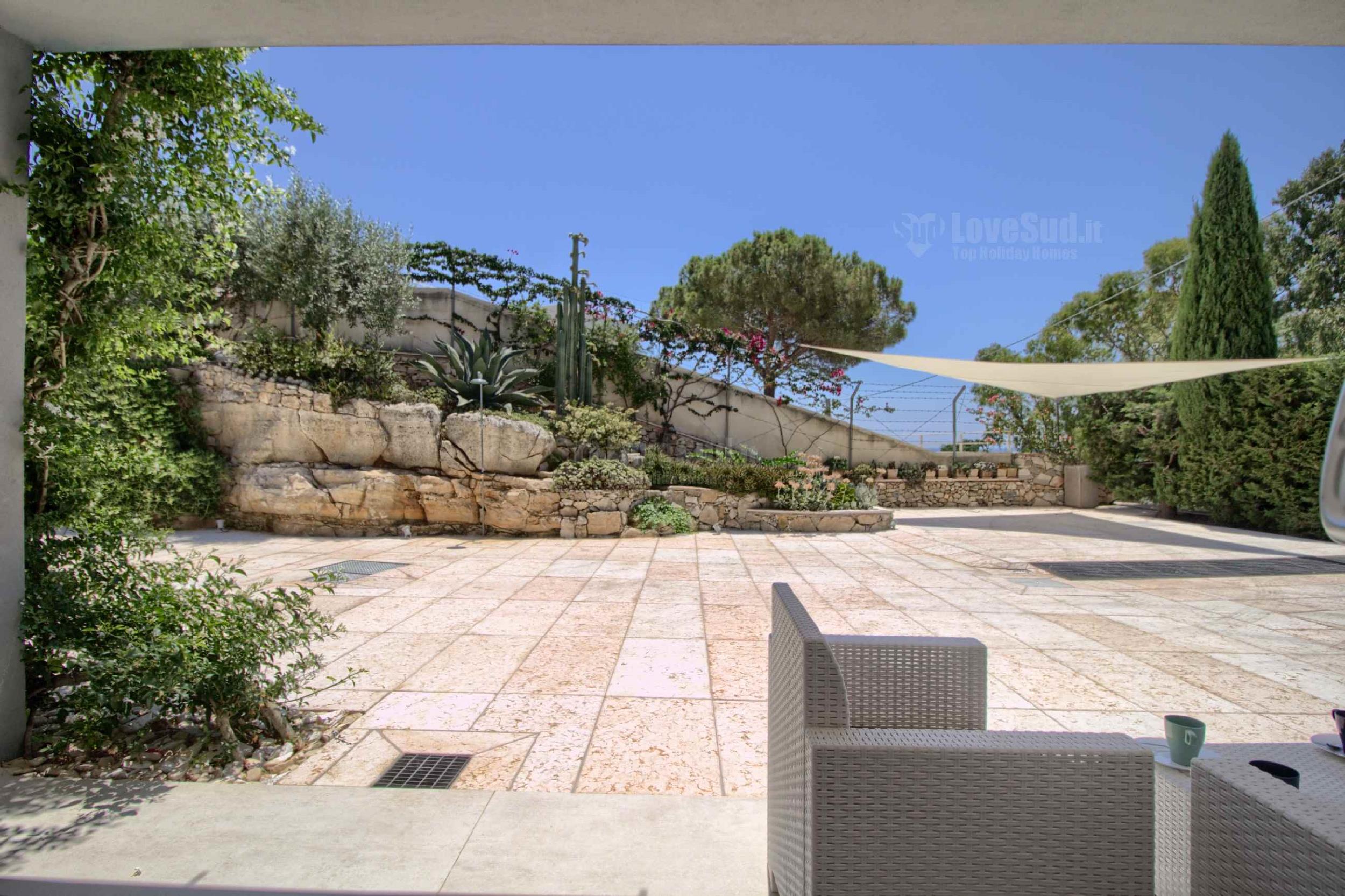 La villa è circondata da un giardino di 1500 mq con muretti a secco e piante grasse che rendono unico l’incantevole spazio esterno e dal quale si può ammirare una splendida vista mare.
