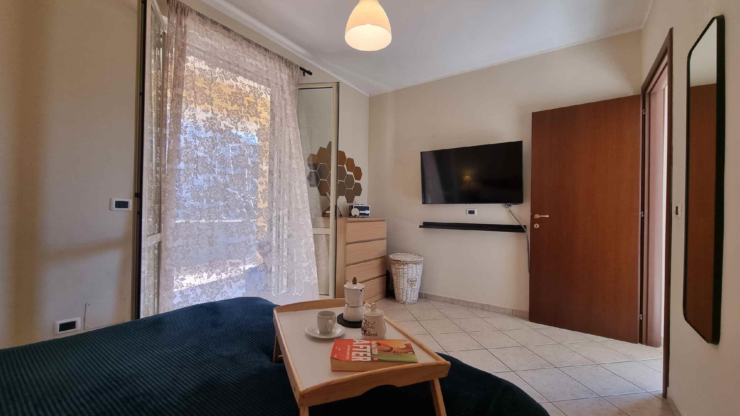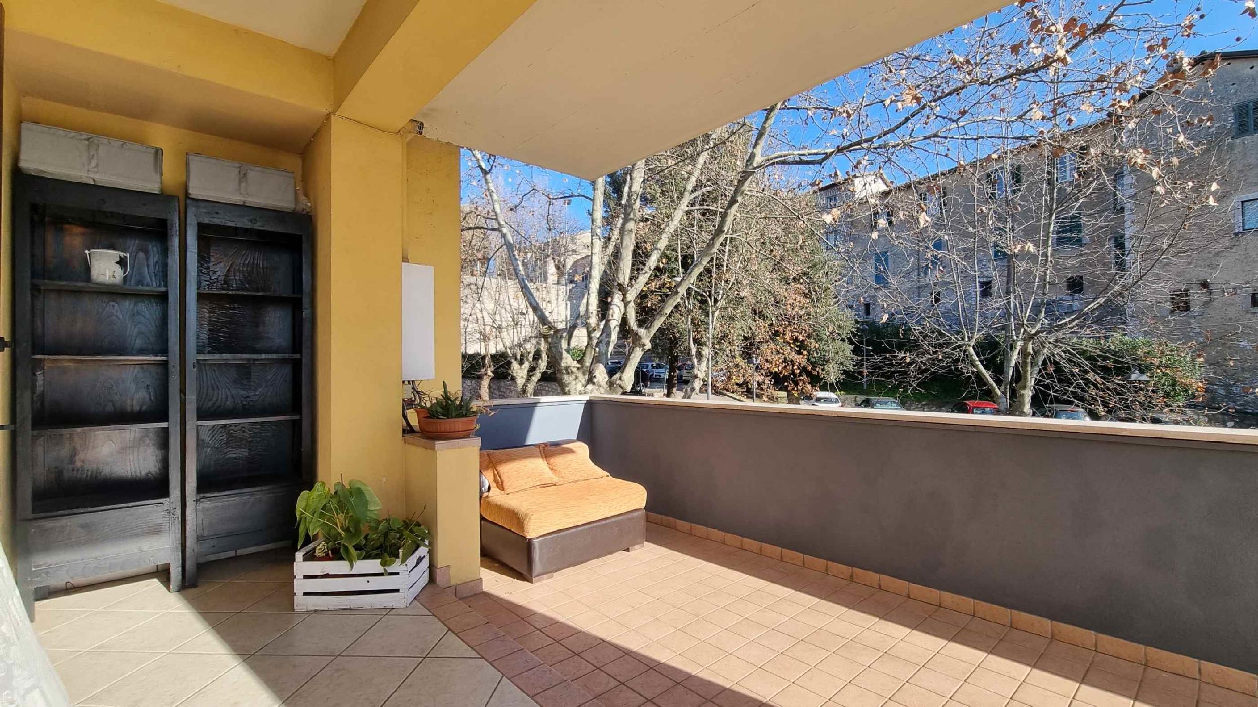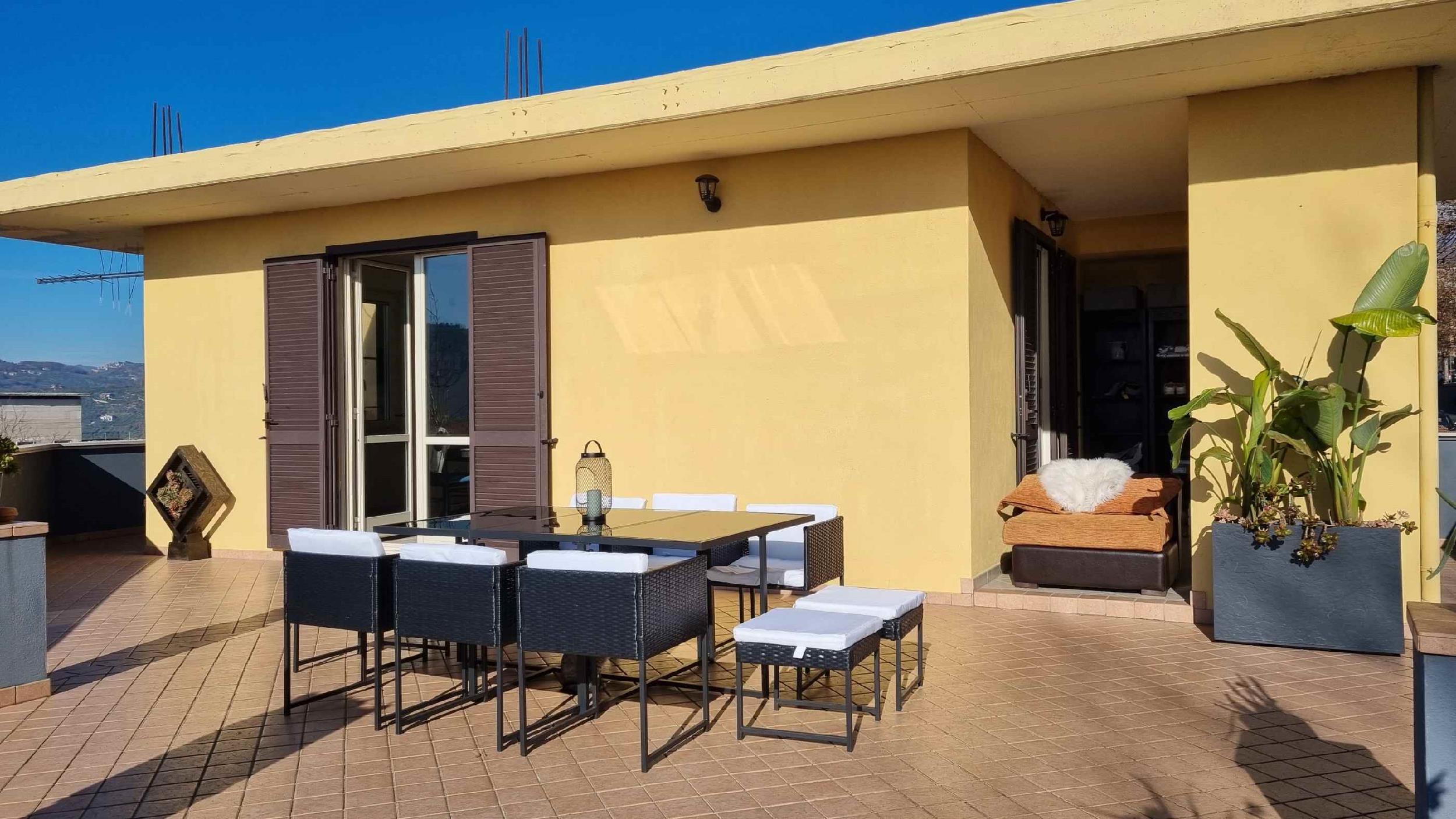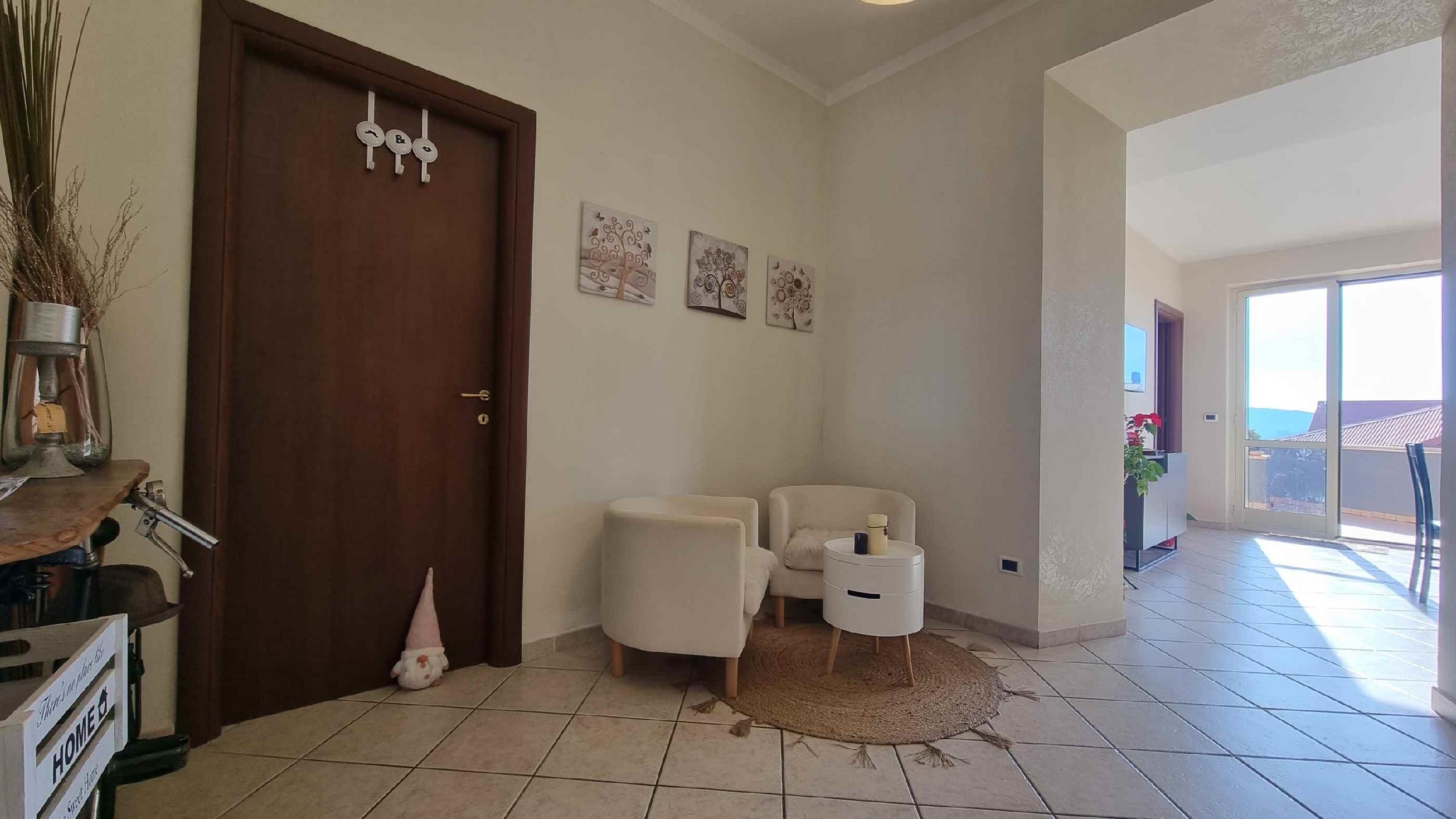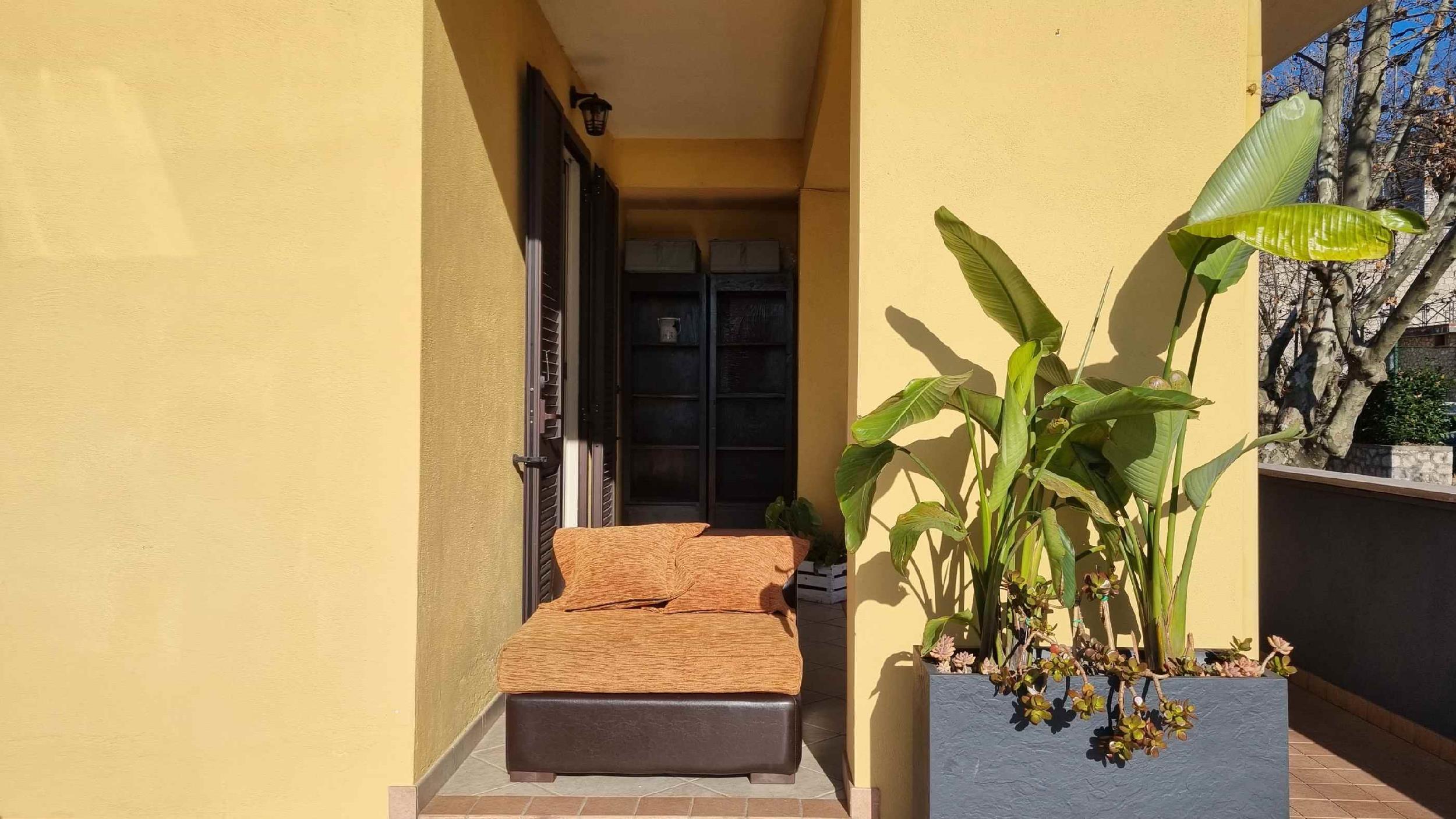 Ad Alatri, in un bellissimo borgo incastonato tra le mura di antichi Ciclopi, vi è un delizioso appartamento al primo piano con ampio terrazzo panoramico. La dimora è baciata dal sole già ai suoi primi albori tanto da rendere l’intera struttura molto luminosa e accogliente. La casa gode di un ampio ingresso, un soggiorno living con cucina completamente attrezzata anche con tv e climatizzatore, due ampie camere da letto matrimoniali, una di queste dotate di tv. Dalla camera patronale, così come dalla cucina, è possibile accedere all’ampio terrazzo che quasi completamente avvolge tutta l’abitazione. In questo ampio e confortevole spazio esterno si può comodamente cenare ammirando le mura cicplopiche che cingono il borgo e osservare le incantevoli colline ciociare dove lì va a dormire il sole. Terrazzo attrezzato con sdraio e salottino esterno.