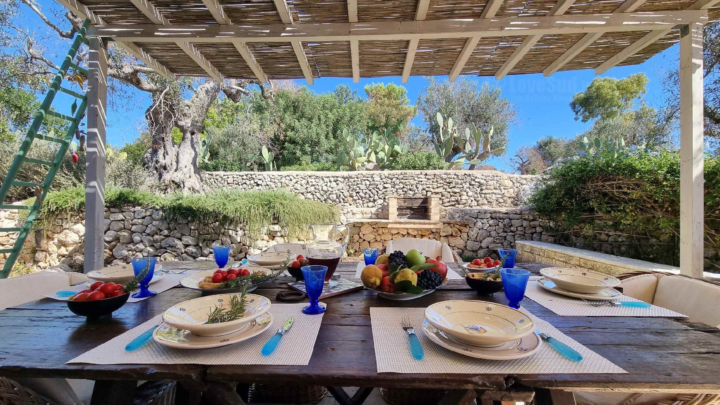 Perfetta l’area esterna attrezzata, all’ombra della pergola. Incantevoli i particolari esterni ed interni in pietra viva.