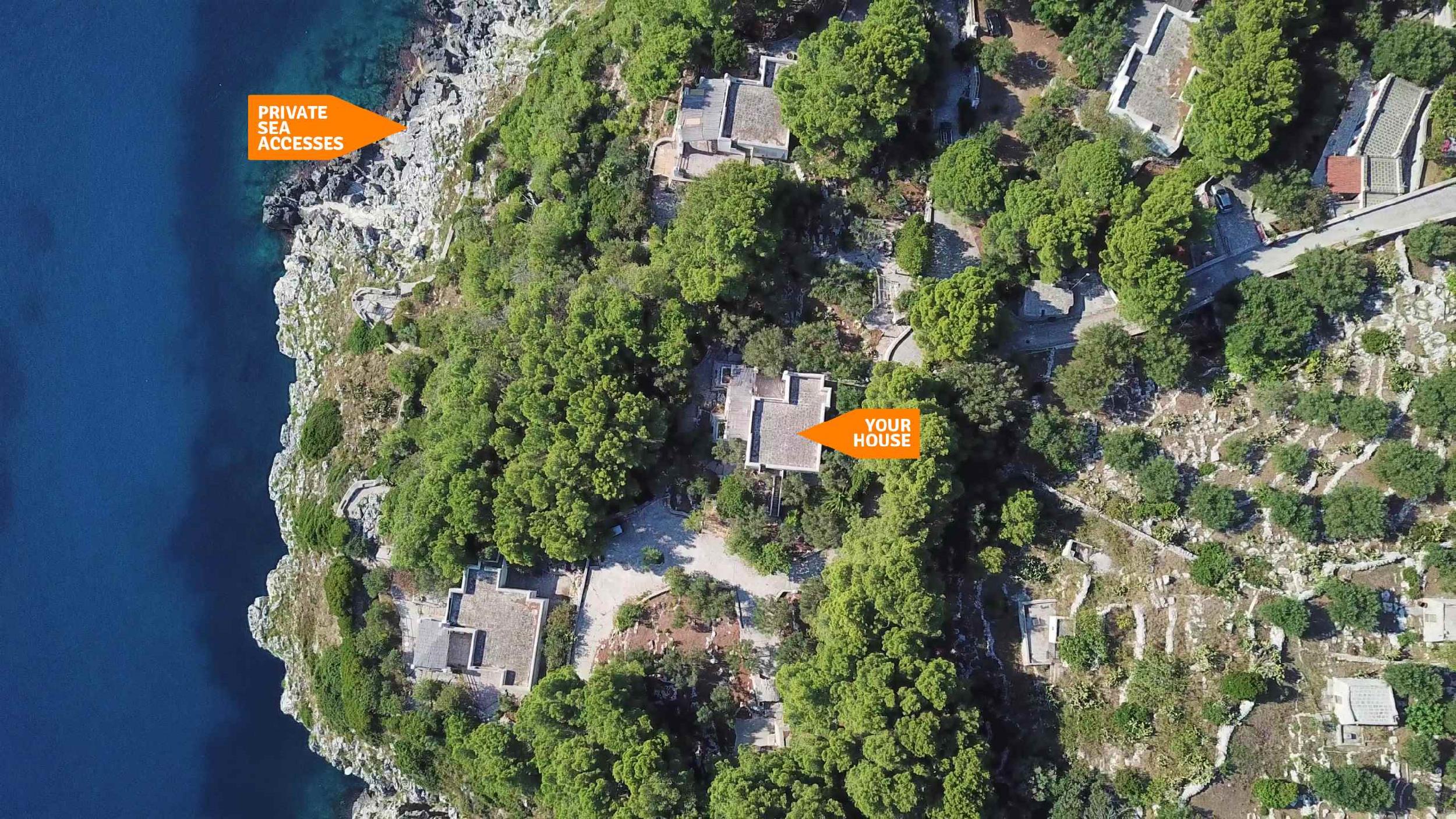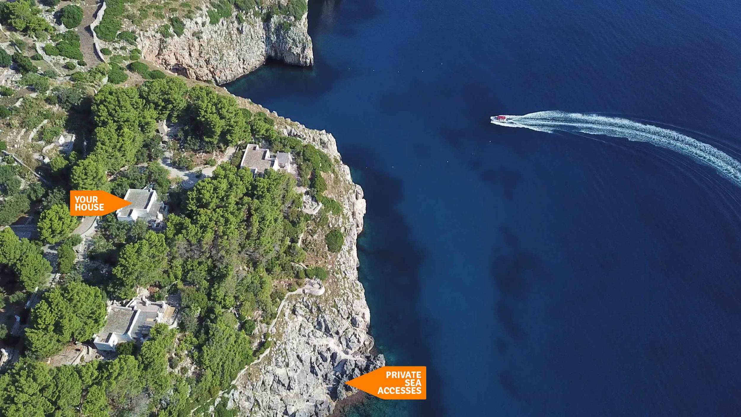 Direttamente dalla proprietà un sentiero privato, passate alcune aree picnic con vista mozzafiato, scende fino al mare, dove quattro accessi consentono il bagno, le immersioni, lo snorkeling o la pesca nell’acqua cristallina del Basso Adriatico. Non è raro avvistare qualche delfino di passaggio (attenzione: sentiero ripido e accessi al mare dagli scogli non adatti a bambini piccoli o persone con difficoltà motorie).