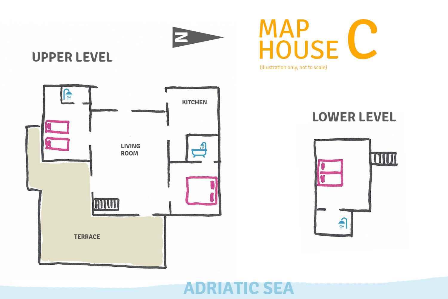 La villa è disposta su due livelli, collegati tra loro con una scala interna: due camere da letto, una matrimoniale e l’altra con due letti singoli, ciascuna con bagno privato, cucina e ampia sala sono situate al piano superiore; al piano inferiore, una camera doppia matrimoniale con bagno. Gli interni sono semplici ma funzionali; non ci sono né TV né aria condizionata, ma le mura spesse e i pini riducono l’impatto del sole estivo. Splendido il terrazzo, completamente immerso nel verde, che offre qualche scorcio sul mare sottostante; suggestivo anche il terrazzo sul tetto, con bella vista mare.