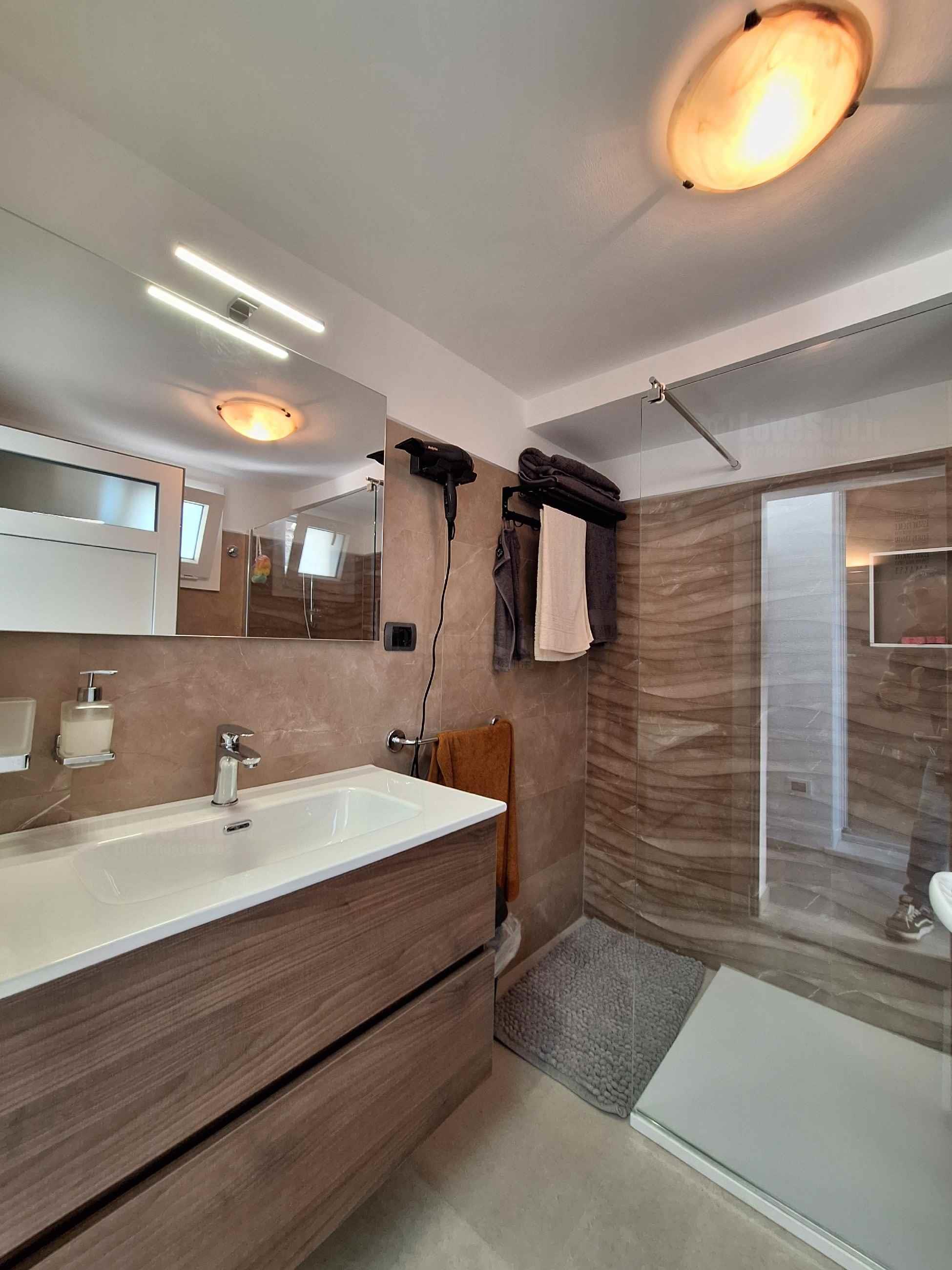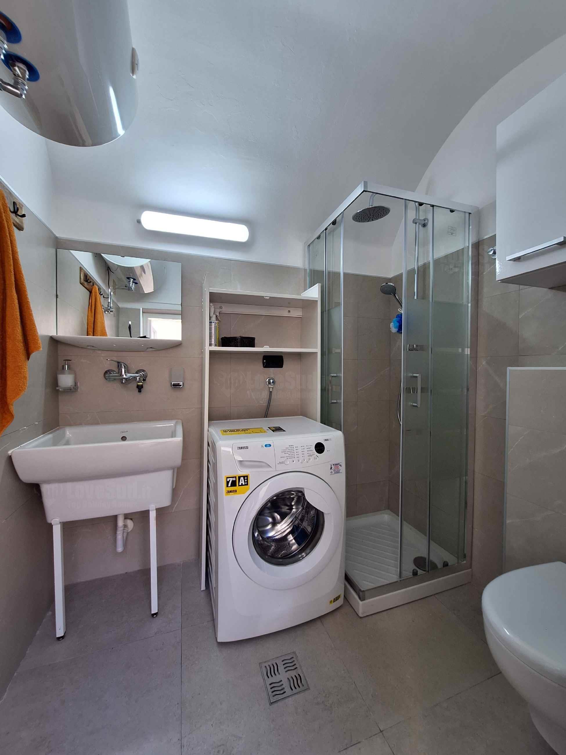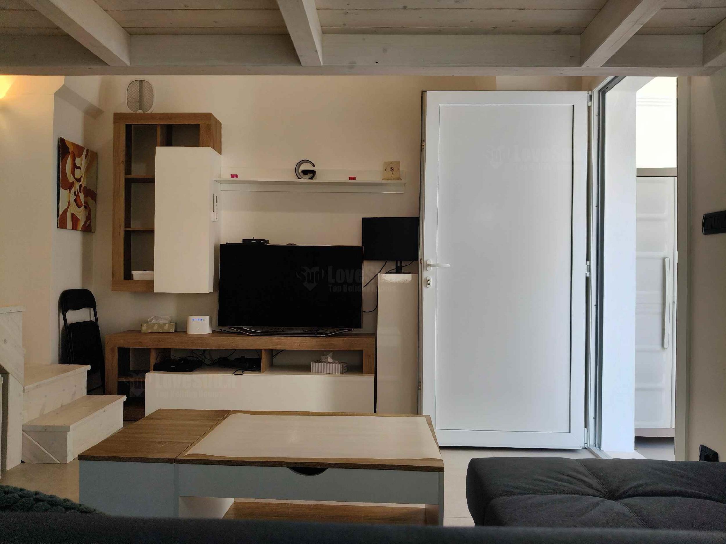 cucina climatizzata di 10 mq circa dotata di tutto l’occorrente con lavastoviglie, microonde, cassaforte, frigorifero, tv, forno e piano a induzione. Tavolo per 4 persone. Esternamente a lato della cucina presente un secondo bagno dotato di lavatrice, servizi e box doccia. Al primo piano, con accesso da scala esterna, presente un grazioso living ricavato da un vano a volta a stella con divano letto angolare, tv satellitare, frigobar, bagno principale con box doccia e camera soppalcata con letto matrimoniale. Entrambe i vani sono climatizzati.