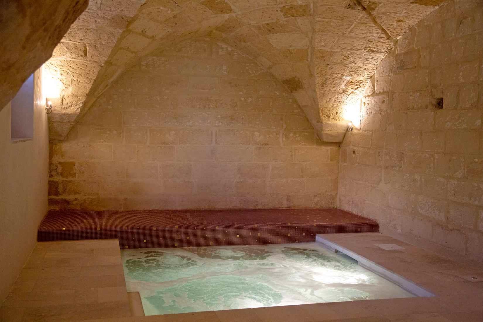 La Spa, sotto le volte a stella in pietra leccese, dispone di una grande vasca idromassaggio che domina la prima sala; mentre, nella seconda sauna, bagno turco e doccia emozionale completano il percorso di assoluto benessere.