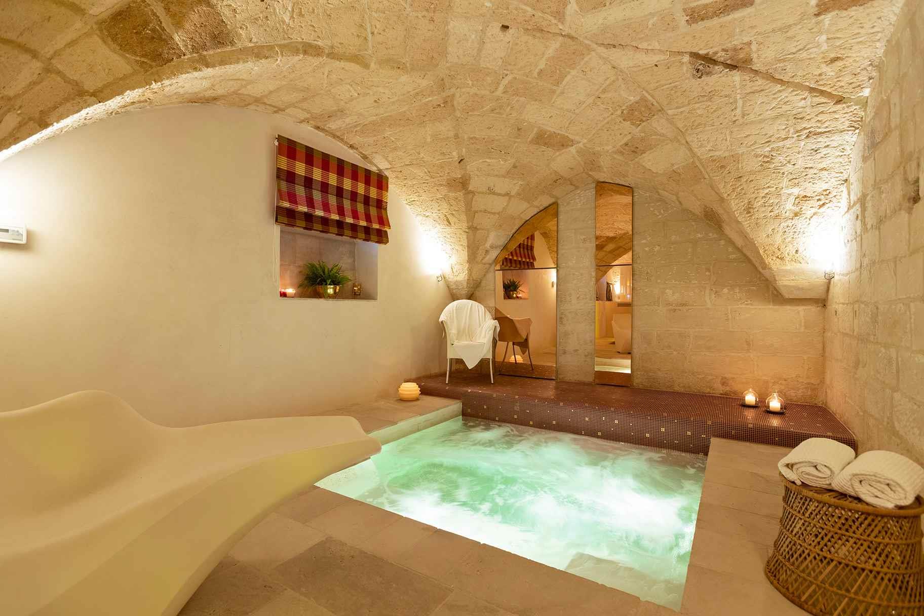 La Spa, sotto le volte a stella in pietra leccese, dispone di una grande vasca idromassaggio che domina la prima sala; mentre, nella seconda sauna, bagno turco e doccia emozionale completano il percorso di assoluto benessere.
