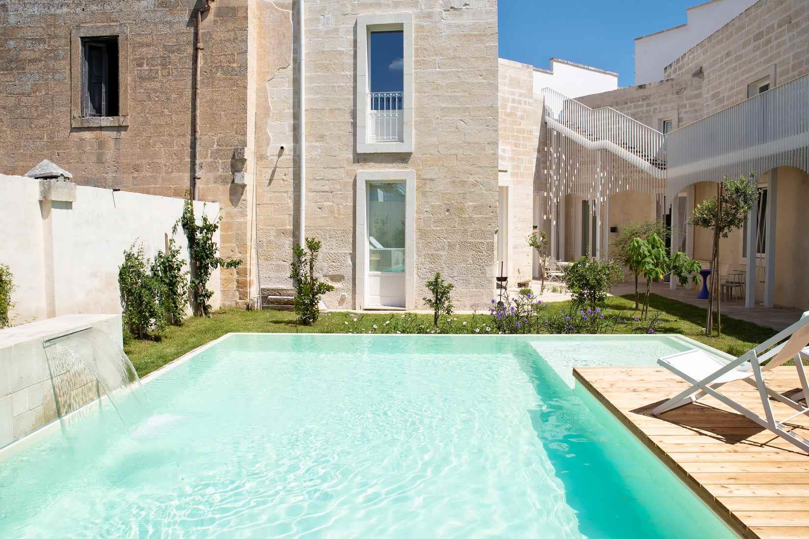 La piscina con bordo a sfioro si inserisce armonicamente nel giardino, parte di un antico agrumeto, ed è collegata al solarium sul terrazzo da una scala bianca; un’ampia pedana in legno accoglie la vasca idromassaggio e la cascata, luogo perfetto dove rilassarsi. Dall’acqua lo sguardo si rivolge alla casa e al calore della pietra leccese o alle cime degli aranci che fanno capolino tutto intorno.
