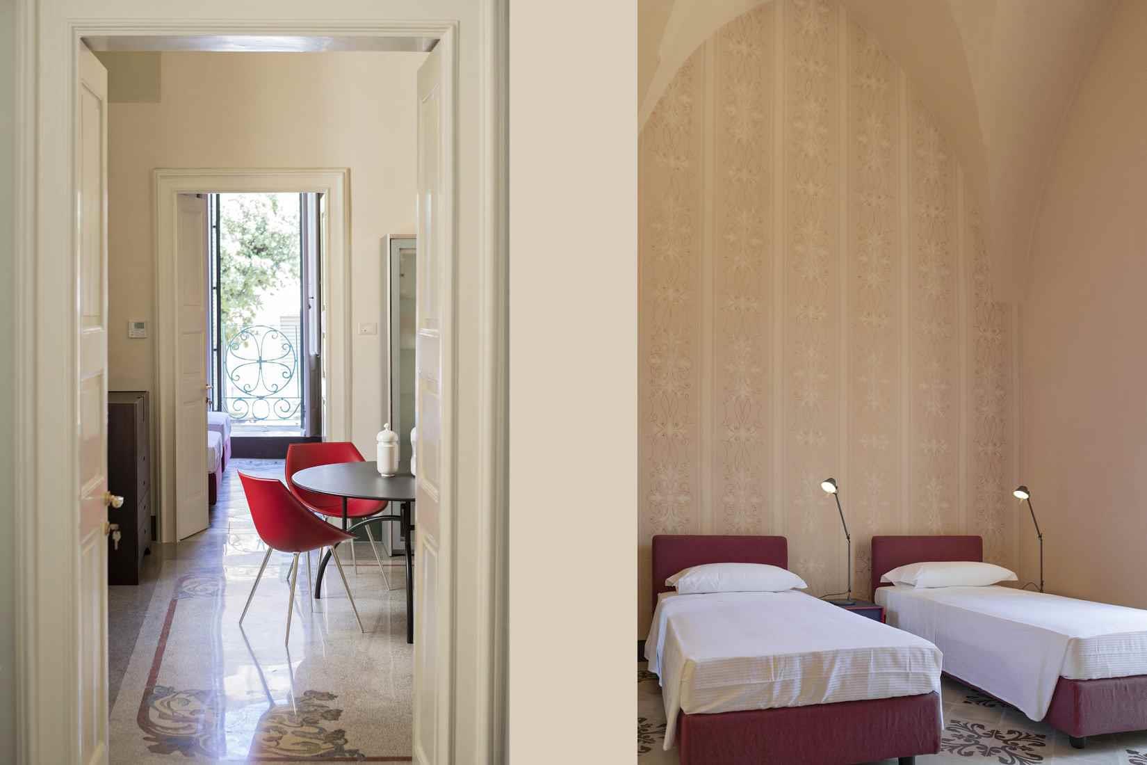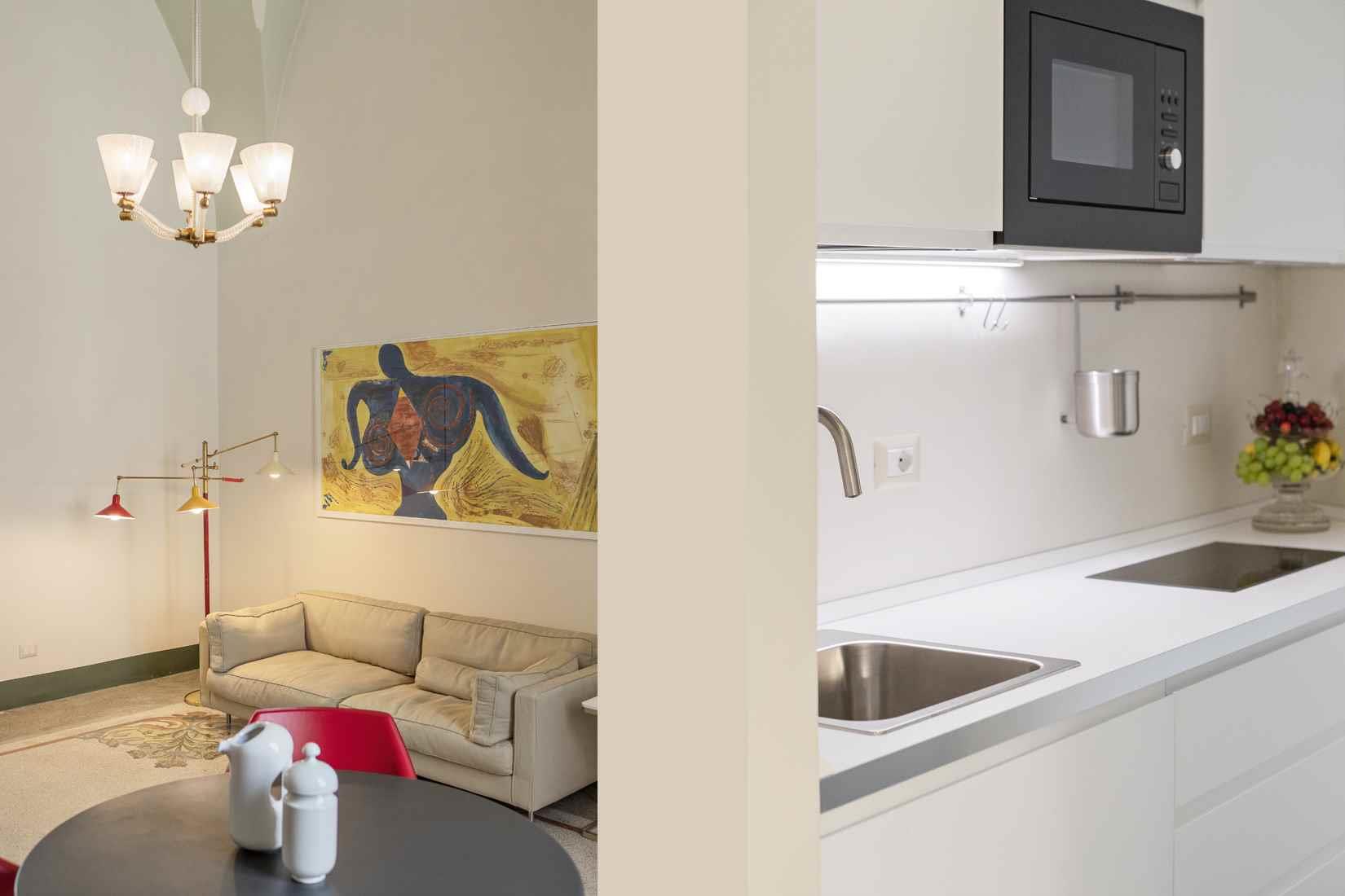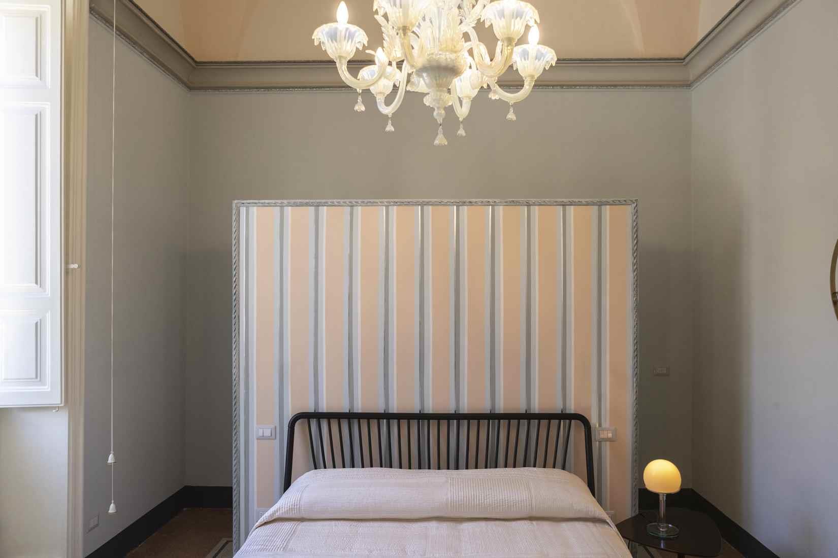 La ristrutturazione ha conservato gli spazi originali della casa e recuperato i bellissimi pavimenti decorati in gettata di graniglia e le decorazioni sulle volte a stella e sulle pareti; il grande salone in stile Impero è stato restaurato con attenzione conservando gli arredi d’epoca, creando così un arredamento vintage e di design.