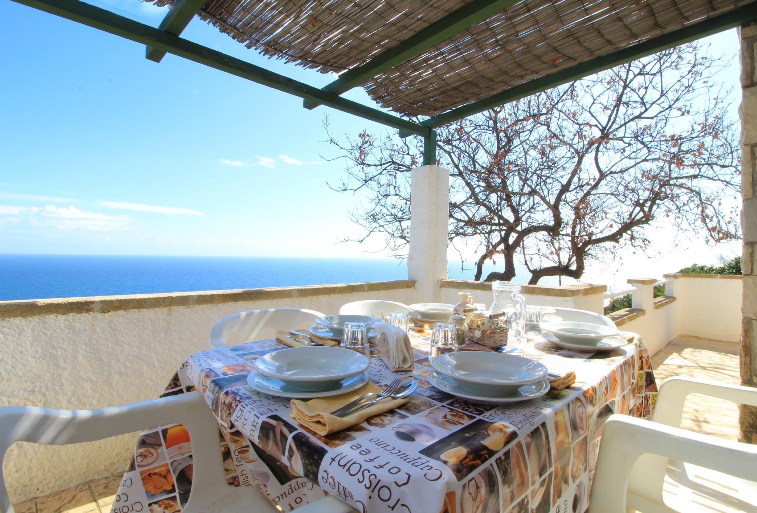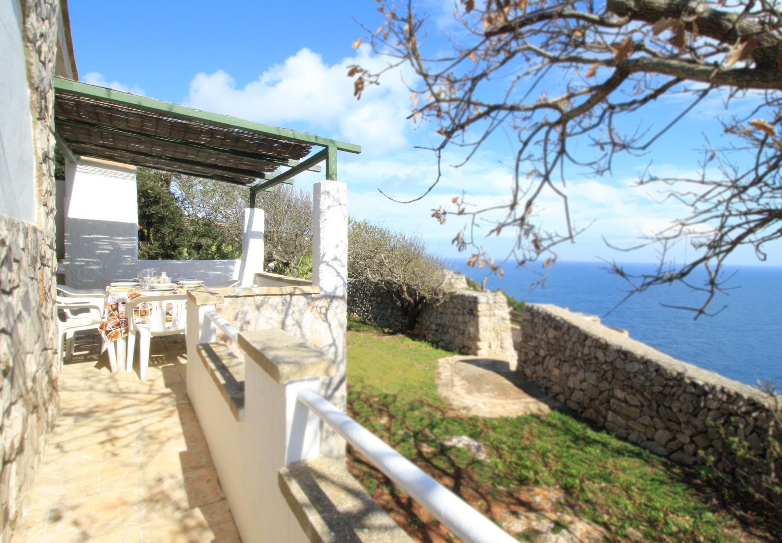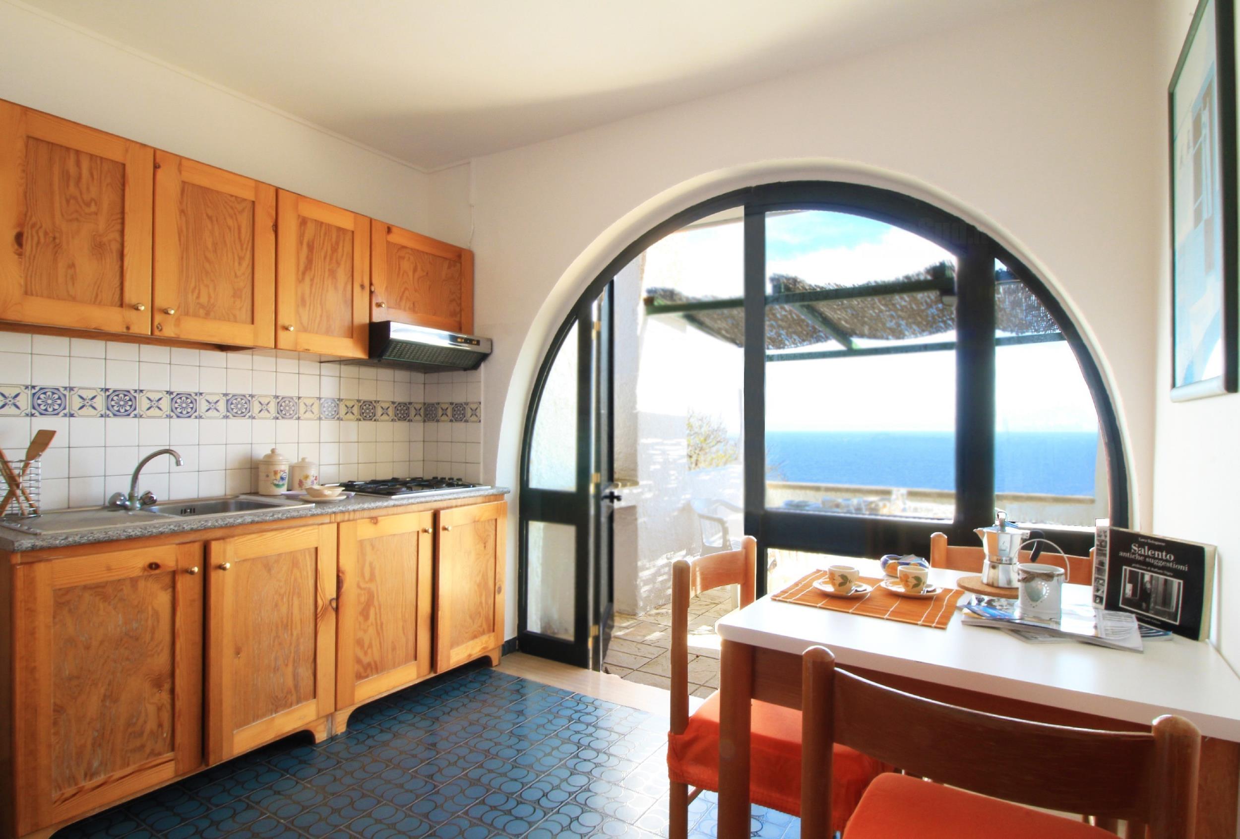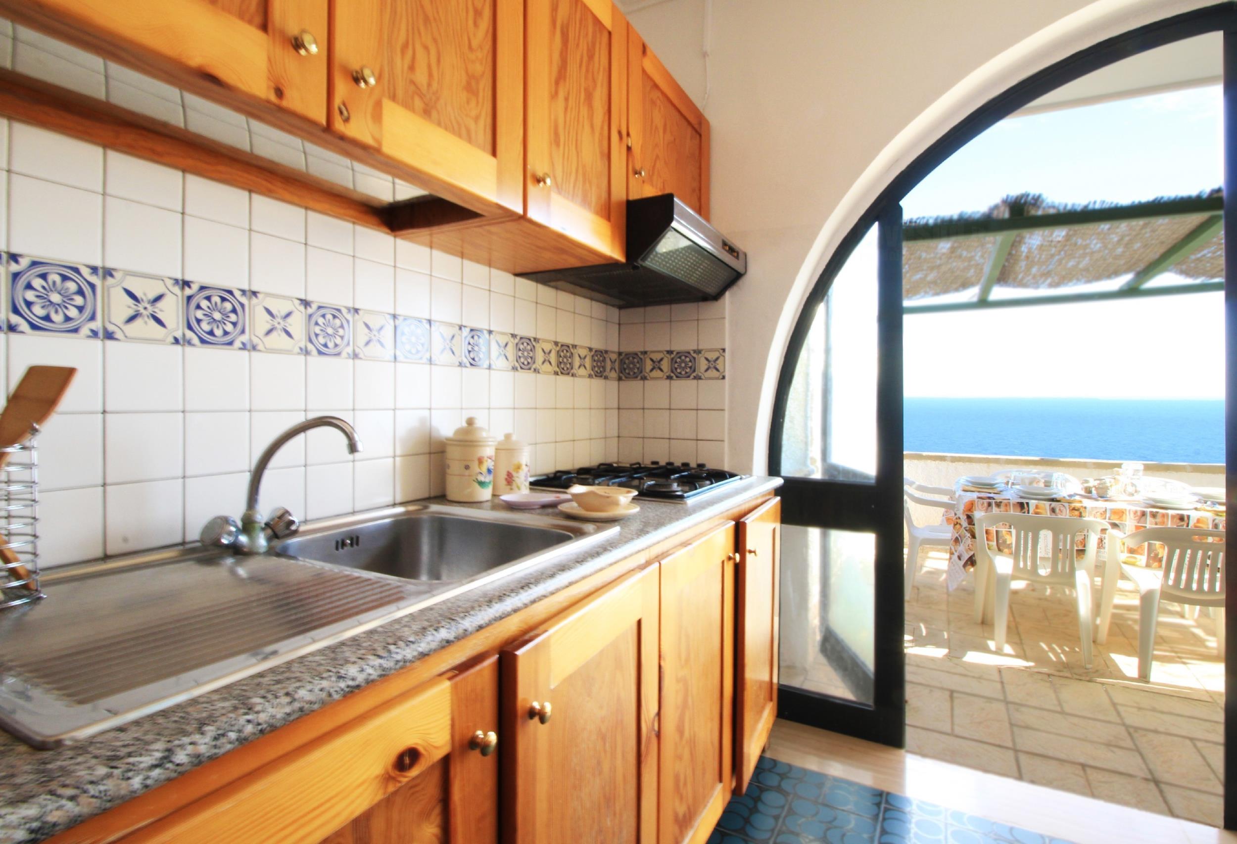 L’abitazione gode di una splendida vista mare e di assoluta riservatezza. Dispone esternamente di parcheggio auto sotto casa, ampio patio recintato dotato di gazebo e arredamento esterno da cui godere di una vista mare unica e meravigliosa. All’interno vi è un ampio soggiorno con divano letto e piccolo salottino riservato, vicino una graziosa cucina, vista mare, accessoriata e con accesso alla veranda. Nella zona notte ci sono due camere da letto, una matrimoniale e una doppia. Infine due bagni, dotati di tutti i servizi.